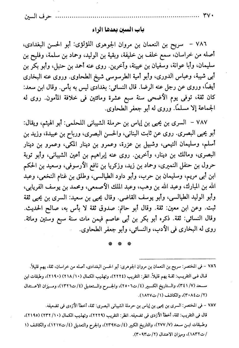 786 - سريح بن النعمان بن مروان الجوهرى اللؤلؤى: أبو الحسن البغدادى، أصله من خراسان، سمع خلف بن خليفة، وبقية بن الوليد، وحماد بن سلمة، وفليح بن سليمان، وأبا عوانة، وسفيان بن عيينة، وآخرين. روى عنه أحمد بن حنبل، وأبو بكر بن أبى شيبة، وعباس الدورى، وأبو أمية الطرسوسى شيخ الطحاوى. وروى عنه البخارى أيضًا، وروى عن رجل عنه الرضا. قال النسائى: بغدادى ليس به بأس. وقال ابن سعد: كان ثقة، توفى يوم الأضحى سنة سبع عشرة ومائتين فى خلافة المأمون. روى له الجماعة إلا مسلمًا. وروى له أبو جعفر الطحاوى.