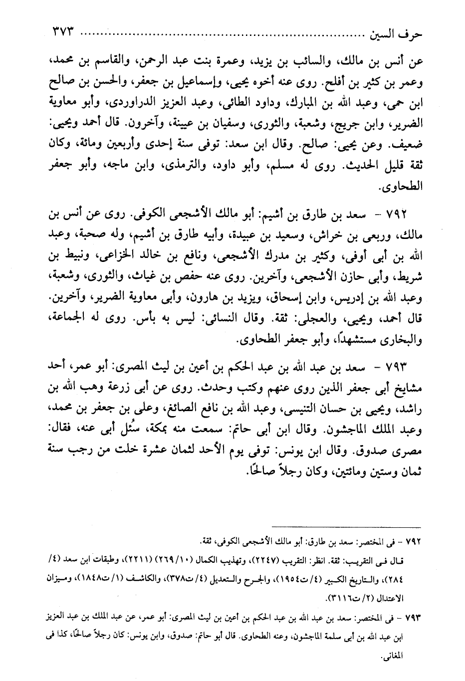 792 - سعد بن طارق بن أشيم: أبو مالك الأشجعى الكوفى. روى عن أنس بن مالك، وربعى بن خراش، وسعيد بن عبيدة، وأبيه طارق بن أشيم، وله صحبة، وعبد الله بن أبى أوفى، وكثير بن مدرك الأشجعى، ونافع بن خالد الخزاعى، ونبيط بن شريط، وأبى حازن الأشجعى، وآخرين. روى عنه حفص بن غياث، والثورى، وشعبة، وعبد الله بن إدريس، وابن إسحاق، ويزيد بن هارون، وأبى معاوية الضرير، وآخرين. قال أحمد، ويحيى، والعجلى: ثقة. وقال النسائى: ليس به بأس. روى له الجماعة، والبخارى مستشهدًا، وأبو جعفر الطحاوى.