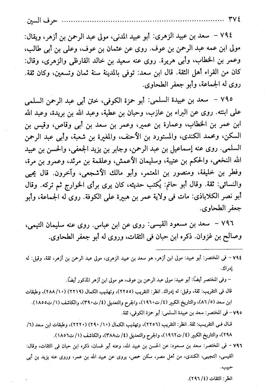 794 - سعد بن عبيد الزهرى: أبو عبيد المدنى، مولى عبد الرحمن بن أزهر، ويقال: مولى ابن عمه عبد الرحمن بن عوف. روى عن عثمان بن عوف، وعلى بن أبى طالب، وعمر بن الخطاب، وأبى هريرة. روى عنه سعيد بن خالد القارظى والزهرى، وقال: كان من القراء أهل الثقة. قال ابن سعد: توفى بالمدينة سنة ثمان وتسعين، وكان ثقة. روى له الجماعة، وأبو جعفر الطحاوى.