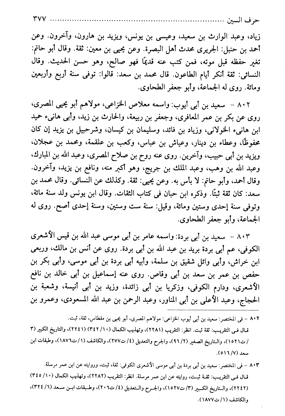 803 - سعيد بن أبى بردة: واسمه عامر بن أبى موسى عبد الله بن قيس الأشعرى الكوفى، عم أبى بردة بريد بن عبد الله بن أبى بردة. روى عن أنس بن مالك، وربعى ابن خراش، وأبى وائل شقيق بن سلمة، وأبيه أبى بردة بن أبى موسى، وأبى بكر بن حفص بن عمر بن سعد بن أبى وقاص. روى عنه إسماعيل بن أبى خالد بن نافع الأشعرى، ودارم الكوفى، وزكريا بن أبى زائدة، وزيد بن أبى أنيسة، وشعبة بن الحجاج، وعبد الأعلى بن أبى المناور، وعبد الرحمن بن عبد الله المسعودى، وعمرو بن
