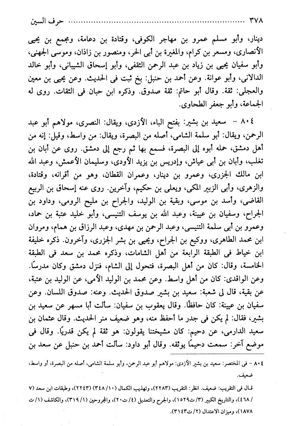 804 - فى المختصر: سعيد بن بشير الأزدى: مولاهم أبو عبد الرحمن، وأبو سلمة الشامى، أصله من البصرة، أو واسط، ضعيف.
