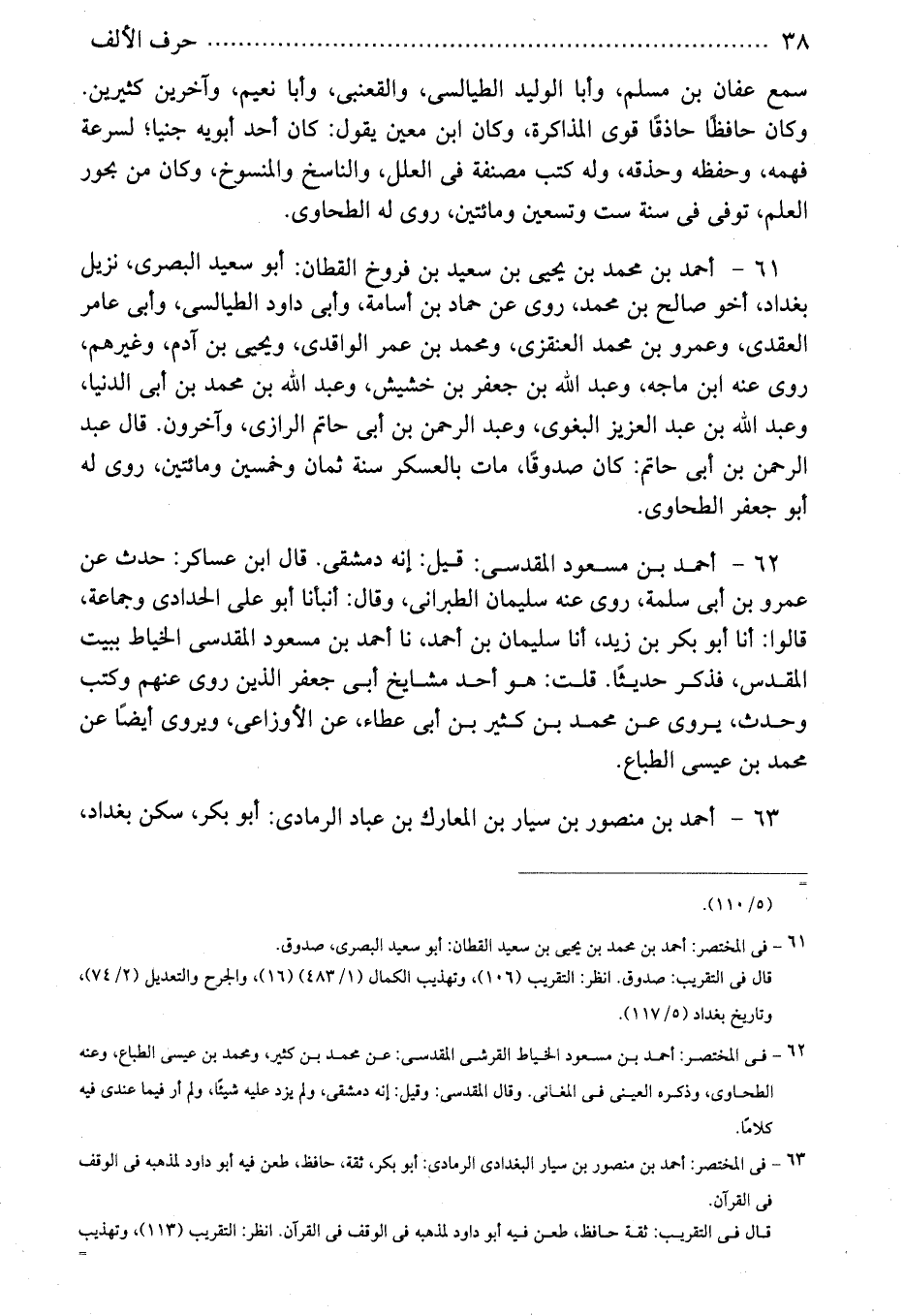 63 - فى المختصر: أحمد بن منصور بن سيار البغدادى الرمادى: أبو بكر، ثقة، حافظ، طعن فيه أبو داود لمذهبه فى الوقف فى القرآن.