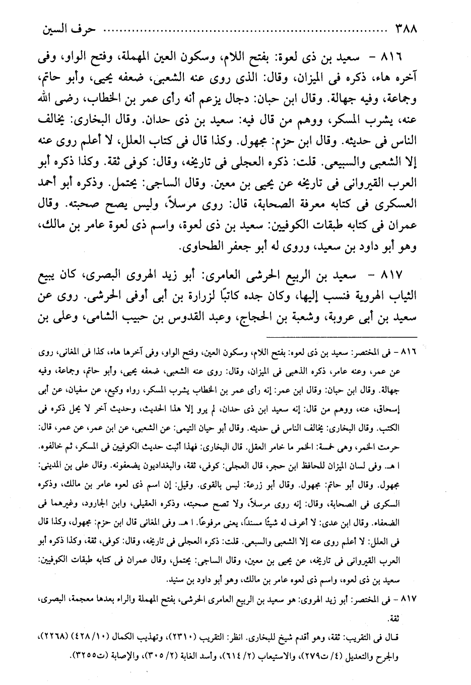 816 - سعيد بن ذى لعوة: بفتح اللام، وسكون العين المهملة، وفتح الواو، وفى آخره هاء، ذكره فى الميزان، وقال: الذى روى عنه الشعبى، ضعفه يحيى، وأبو حاتم، وجماعة، وفيه جهالة. وقال ابن حبان: دجال يزعم أنه رأى عمر بن الخطاب، رضى الله عنه، يشرب المسكر، ووهم من قال فيه: سعيد بن ذى حدان. وقال البخارى: يخالف الناس فى حديثه. وقال ابن حزم: مجهول. وكذا قال فى كتاب العلل، لا أعلم روى عنه إلا الشعبى والسبيعى. قلت: ذكره العجلى فى تاريخه، وقال: كوفى ثقة. وكذا ذكره أبو العرب القيروانى فى تاريخه عن يحيى بن معين. وقال الساجى: يحتمل. وذكره أبو أحمد العسكرى فى كتابه معرفة الصحابة، قال: روى مرسلاً، وليس يصح صحبته. وقال عمران فى كتابه طبقات الكوفيين: سعيد بن ذى لعوة، واسم ذى لعوة عامر بن مالك، وهو أبو داود بن سعيد، وروى له أبو جعفر الطحاوى.