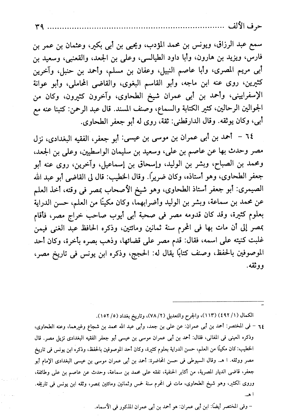 64 - فى المختصر: أحمد بن أبى عمران: عن على بن جعد، وأبى عبد الله محمد بن شجاع وغيرهما، وعنه الطحاوى، وذكره العينى فى المغانى، فقال: أحمد بن أبى عمران موسى بن عيسى أبو جعفر الفقيه البغدادى نزيل مصر. قال الخطيب: كان مكينًا من العلم، حسن الدراية بعلوم كثيرة، وكان أحد الموصوفين بالحفظ، وذكره ابن يونس فى تاريخ مصر ووثقه. ا. هـ. وقال السيوطى فى حسن المحاضرة: أحمد بن أبى عمران موسى بن عيسى البغدادى الإمام أبو جعفر، قاضى الديار المصرية، من أكابر الحنفية، تفقه على محمد بن سماعة، وحدث عن عاصم بن على وطائفة، وروى الكثير، وهو شيخ الطحاوى، مات فى المحرم سنة خمس وثمانين ومائتين بمصر، وثقه ابن يونس فى تاريخه. ا. هـ.