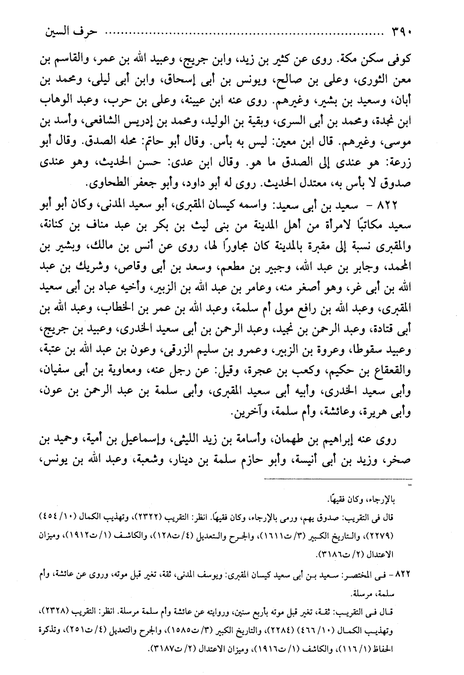 822 - سعيد بن أبى سعيد: واسمه كيسان المقبرى، أبو سعيد المدنى، وكان أبو أبو سعيد مكاتبًا لامرأة من أهل المدينة من بنى ليث بن بكر بن عبد مناف بن كنانة، والمقبرى نسبة إلى مقبرة بالمدينة كان مجاورًا لها، روى عن أنس بن مالك، وبشير بن المحمد، وجابر بن عبد الله، وجبير بن مطعم، وسعد بن أبى وقاص، وشريك بن عبد الله بن أبى غر، وهو أصغر منه، وعامر بن عبد الله بن الزبير، وأخيه عباد بن أبى سعيد المقبرى، وعبد الله بن رافع مولى أم سلمة، وعبد الله بن عمر بن الخطاب، وعبد الله بن أبى قتادة، وعبد الرحمن بن نجيد، وعبد الرحمن بن أبى سعيد الخدرى، وعبيد بن جريج، وعبيد سقوطا، وعروة بن الزبير، وعمرو بن سليم الزرقى، وعون بن عبد الله بن عتبة، والقعقاع بن حكيم، وكعب بن عجرة، وقيل: عن رجل عنه، ومعاوية بن أبى سفيان، وأبى سعيد الخدرى، وأبيه أبى سعيد المقبرى، وأبى سلمة بن عبد الرحمن بن عون، وأبى هريرة، وعائشة، وأم سلمة، وآخرين.