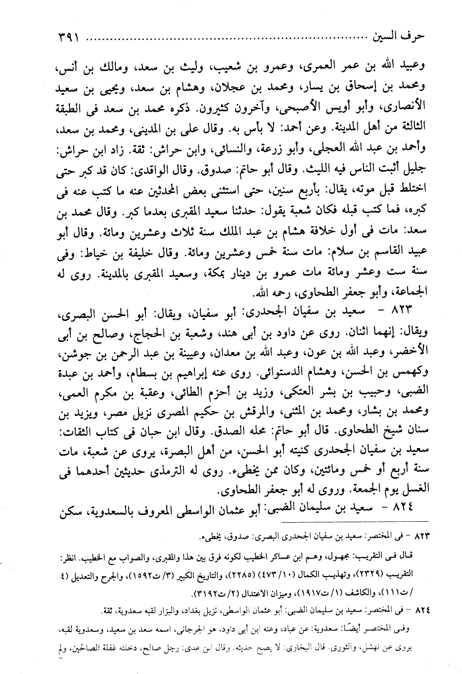 823 - سعيد بن سفيان الجحدرى: أبو سفيان، ويقال: أبو الحسن البصرى، ويقال: إنهما اثنان. روى عن داود بن أبى هند، وشعبة بن الحجاج، وصالح بن أبى الأخضر، وعبد الله بن عون، وعبد الله بن معدان، وعيينة بن عبد الرحمن بن جوشن، وكهمس بن الحسن، وهشام الدستوائى. روى عنه إبراهيم بن بسطام، وأحمد بن عبدة الضبى، وحبيب بن بشر العتكى، وزيد بن أحزم الطائى، وعقبة بن مكرم العمى، ومحمد بن بشار، ومحمد بن المثنى، والمرقش بن حكيم المصرى نزيل مصر، ويزيد بن سنان شيخ الطحاوى. قال أبو حاتم: محله الصدق. وقال ابن حبان فى كتاب الثقات: سعيد بن سفيان الجحدرى كنيته أبو الحسن، من أهل البصرة، يروى عن شعبة، مات سنة أربع أو خمس ومائتين، وكان ممن يخطىء. روى له الترمذى حديثين أحدهما فى الغسل يوم الجمعة. وروى له أبو جعفر الطحاوى.