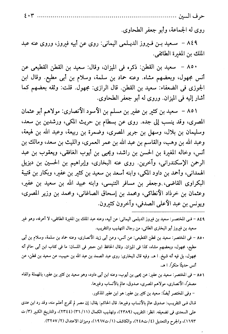 850 - سعيد بن القطن: ذكره فى الميزان، وقال: سعيد بن القطن القطيعى عن أنس مجهول، وبعضهم مشاه. وعنه حماد بن سلمة، وسلام بن أبى مطيع. وقال ابن الجوزى فى الضعفاء: سعيد بن القطن. قال الرازى: مجهول. قلت: وثقه بعضهم كما أشار إليه فى الميزان. وروى له أبو جعفر الطحاوى.