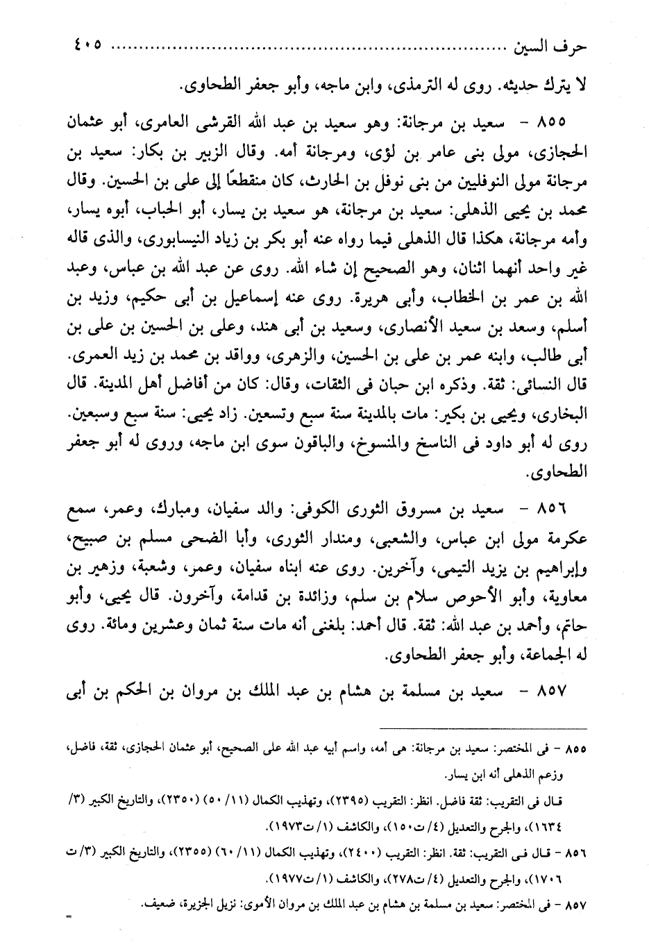 855 - سعيد بن مرجانة: وهو سعيد بن عبد الله القرشى العامرى، أبو عثمان الحجازى، مولى بنى عامر بن لؤى، ومرجانة أمه. وقال الزبير بن بكار: سعيد بن مرجانة مولى النوفليين من بنى نوفل بن الحارث، كان منقطعًا إلى على بن الحسين. وقال محمد بن يحيى الذهلى: سعيد بن مرجانة، هو سعيد بن يسار، أبو الحباب، أبوه يسار، وأمه مرجانة، هكذا قال الذهلى فيما رواه عنه أبو بكر بن زياد النيسابورى، والذى قاله غير واحد أنهما اثنان، وهو الصحيح إن شاء الله. روى عن عبد الله بن عباس، وعبد الله بن عمر بن الخطاب، وأبى هريرة. روى عنه إسماعيل بن أبى حكيم، وزيد بن أسلم، وسعد بن سعيد الأنصارى، وسعيد بن أبى هند، وعلى بن الحسين بن على بن أبى طالب، وابنه عمر بن على بن الحسين، والزهرى، وواقد بن محمد بن زيد العمرى. قال النسائى: ثقة. وذكره ابن حبان فى الثقات، وقال: كان من أفاضل أهل المدينة. قال البخارى، ويحيى بن بكير: مات بالمدينة سنة سبع وتسعين. زاد يحيى: سنة سبع وسبعين. روى له أبو داود فى الناسخ والمنسوخ، والباقون سوى ابن ماجه، وروى له أبو جعفر الطحاوى.