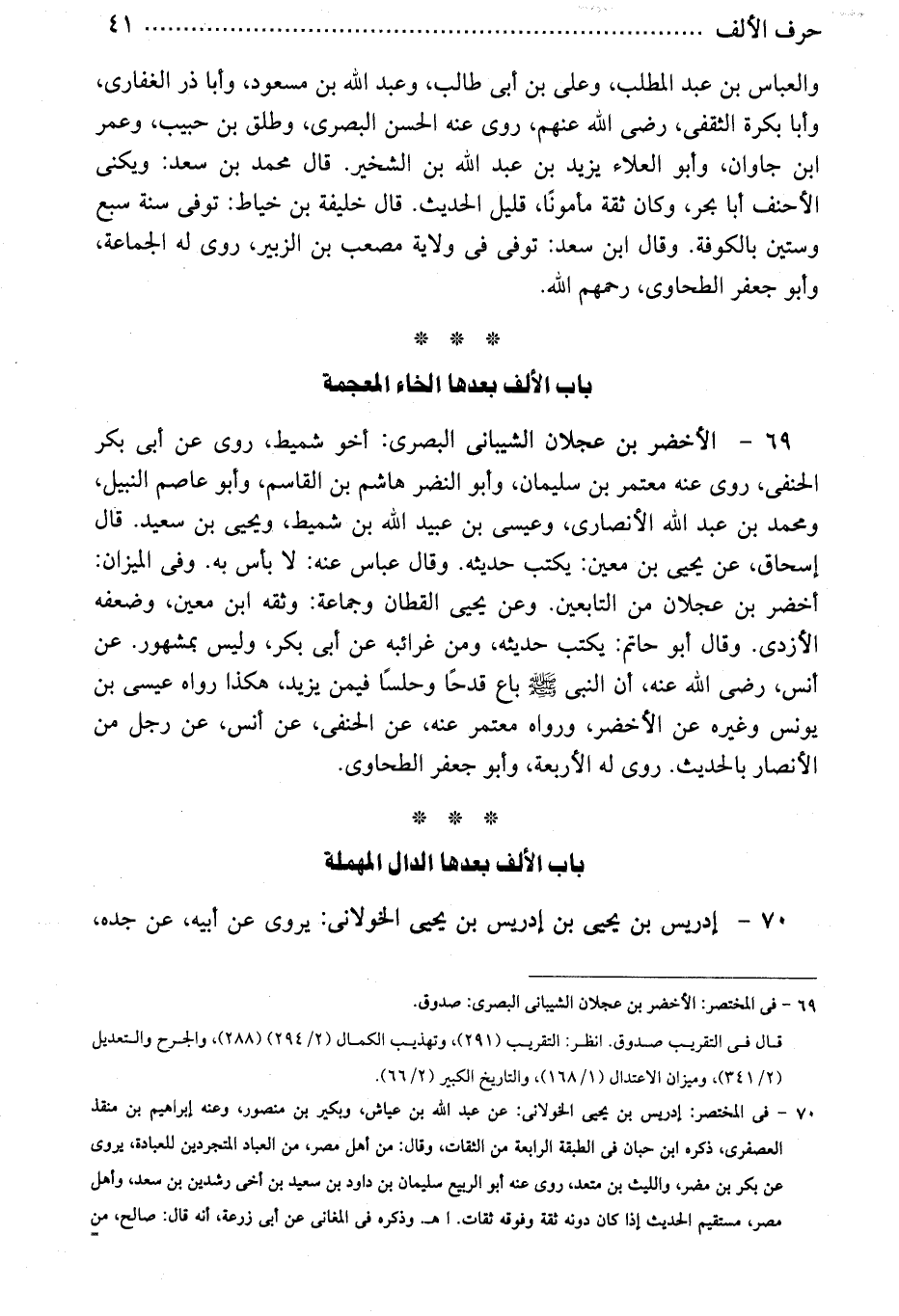 69 - الأخضر بن عجلان الشيبانى البصرى: أخو شميط، روى عن أبى بكر الحنفى، روى عنه معتمر بن سليمان، وأبو النضر هاشم بن القاسم، وأبو عاصم النبيل، ومحمد بن عبد الله الأنصارى، وعيسى بن عبيد الله بن شميط، ويحيى بن سعيد. قال إسحاق، عن يحيى بن معين: يكتب حديثه. وقال عباس عنه: لا بأس به. وفى الميزان: أخضر بن عجلان من التابعين. وعن يحيى القطان وجماعة: وثقه ابن معين، وضعفه الأزدى. وقال أبو حاتم: يكتب حديثه، ومن غرائبه عن أبى بكر، وليس بمشهور. عن أنس، رضى الله عنه، أن النبى - صلى الله عليه وسلم - باع قدحًا وحلسًا فيمن يزيد، هكذا رواه عيسى بن يونس وغيره عن الأخضر، ورواه معتمر عنه، عن الحنفى، عن أنس، عن رجل من الأنصار بالحديث. روى له الأربعة، وأبو جعفر الطحاوى.