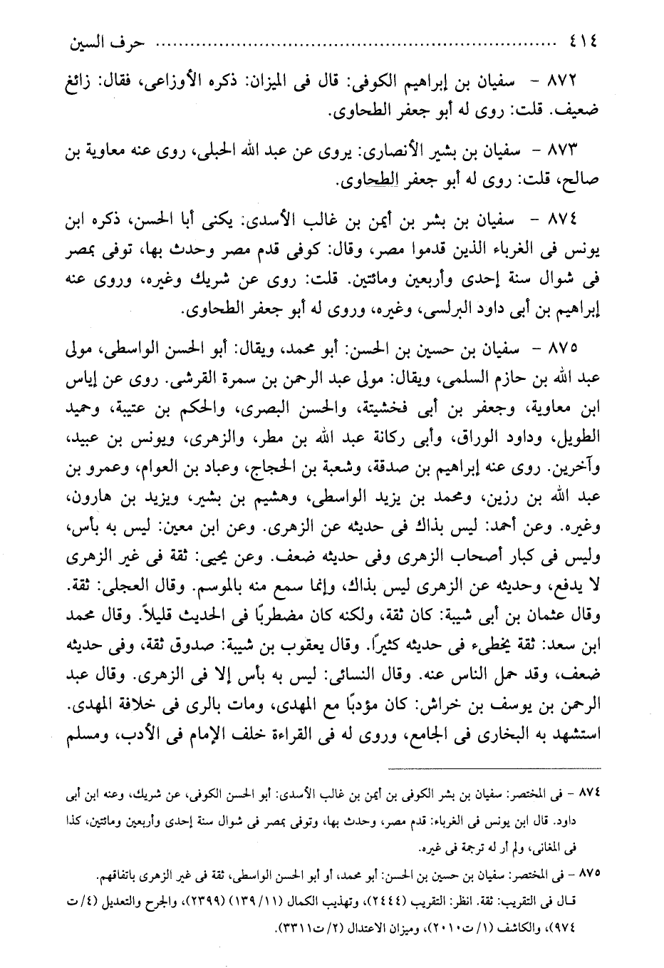 872 - سفيان بن إبراهيم الكوفى: قال فى الميزان: ذكره الأوزاعى، فقال: زائغ ضعيف. قلت: روى له أبو جعفر الطحاوى.