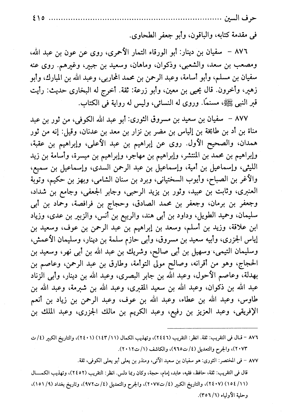877 - سفيان بن سعيد بن مسروق الثورى: أبو عبد الله الكوفى، من ثور بن عبد مناة بن أد بن طابخة بن إلياس بن مضر بن نزار بن معد بن عدنان، وقيل: إنه من ثور همدان، والصحيح الأول. روى عن إبراهيم بن عبد الأعلى، وإبراهيم بن عقبة، وإبراهيم بن محمد بن المنتشر، وإبراهيم بن مهاجر، وإبراهيم بن ميسرة، وأسامة بن زيد الليثى، وإسماعيل بن أمية، وإسماعيل بن عبد الرحمن السدى، وإسماعيل بن سميع، والأغر بن الصباح، وأيوب السختيانى، وبرد بن سنان الشامى، وبهز بن حكيم، وتوبة العنبرى، وثابت بن عبيد، وثور بن يزيد الرحبى، وجابر الجعفى، وجامع بن شداد، وجعفر بن برمان، وجعفر بن محمد الصادق، وحجاج بن فرافصة، وحماد بن أبى سليمان، وحميد الطويل، وداود بن أبى هند، والربيع بن أنس، والزبير بن عدى، وزياد ابن علاقة، وزيد بن أسلم، وسعد بن إبراهيم بن عبد الرحمن بن عوف، وسعيد بن إياس الجزرى، وأبيه سعيد بن مسروق، وأبى حازم سلمة بن دينار، وسليمان الأعمش، وسليمان التيمى، وسهيل بن أبى صالح، وشريك بن عبد الله بن أبى نهر، وسعيد بن الحجاج، وهو من أقرانه، وصالح مولى التوأمة، وطارق بن عبد الرحمن، وعاصم بن بهدلة، وعاصم الأحول، وعبد الله بن جابر البصرى، وعبد الله بن دينار، وأبى الزناد عبد الله بن ذكوان، وعبد الله بن سعيد المقبرى، وعبد الله بن شبرمة، وعبد الله بن طاووس، وعبد الله بن عطاء، وعبد الله بن عوف، وعبد الرحمن بن زياد بن أنعم الإفريقى، وعبد العزيز بن رفيع، وعبد الكريم بن مالك الجزرى، وعبد الملك بن