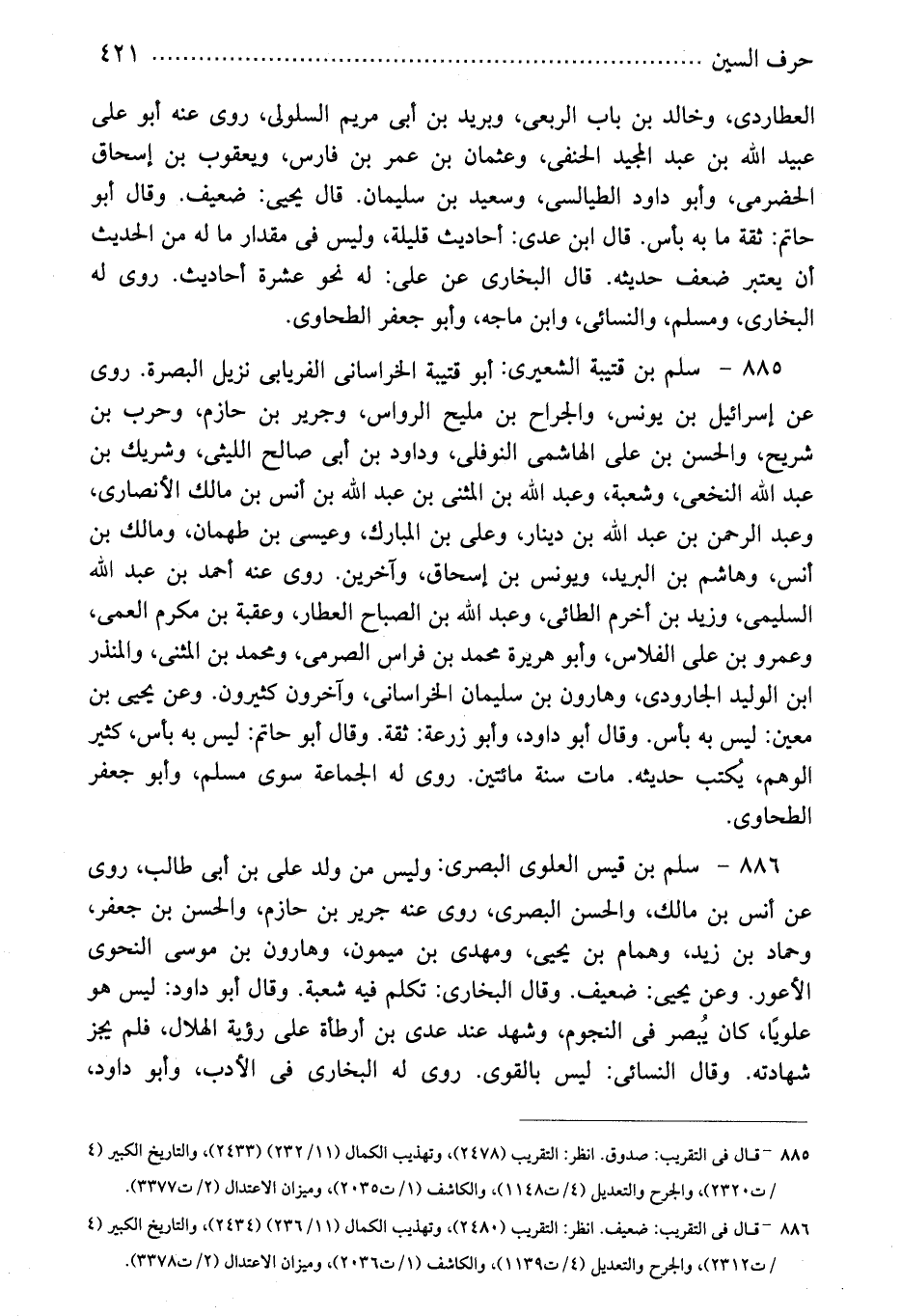 886 - سلم بن قيس العلوى البصرى: وليس من ولد على بن أبى طالب، روى عن أنس بن مالك، والحسن البصرى، روى عنه جرير بن حازم، والحسن بن جعفر، وحماد بن زيد، وهمام بن يحيى، ومهدى بن ميمون، وهارون بن موسى النحوى الأعور. وعن يحيى: ضعيف. وقال البخارى: تكلم فيه شعبة. وقال أبو داود: ليس هو علويًا، كان يُبصر فى النجوم، وشهد عند عدى بن أرطأة على رؤية الهلال، فلم يجز شهادته. وقال النسائى: ليس بالقوى. روى له البخارى فى الأدب، وأبو داود،