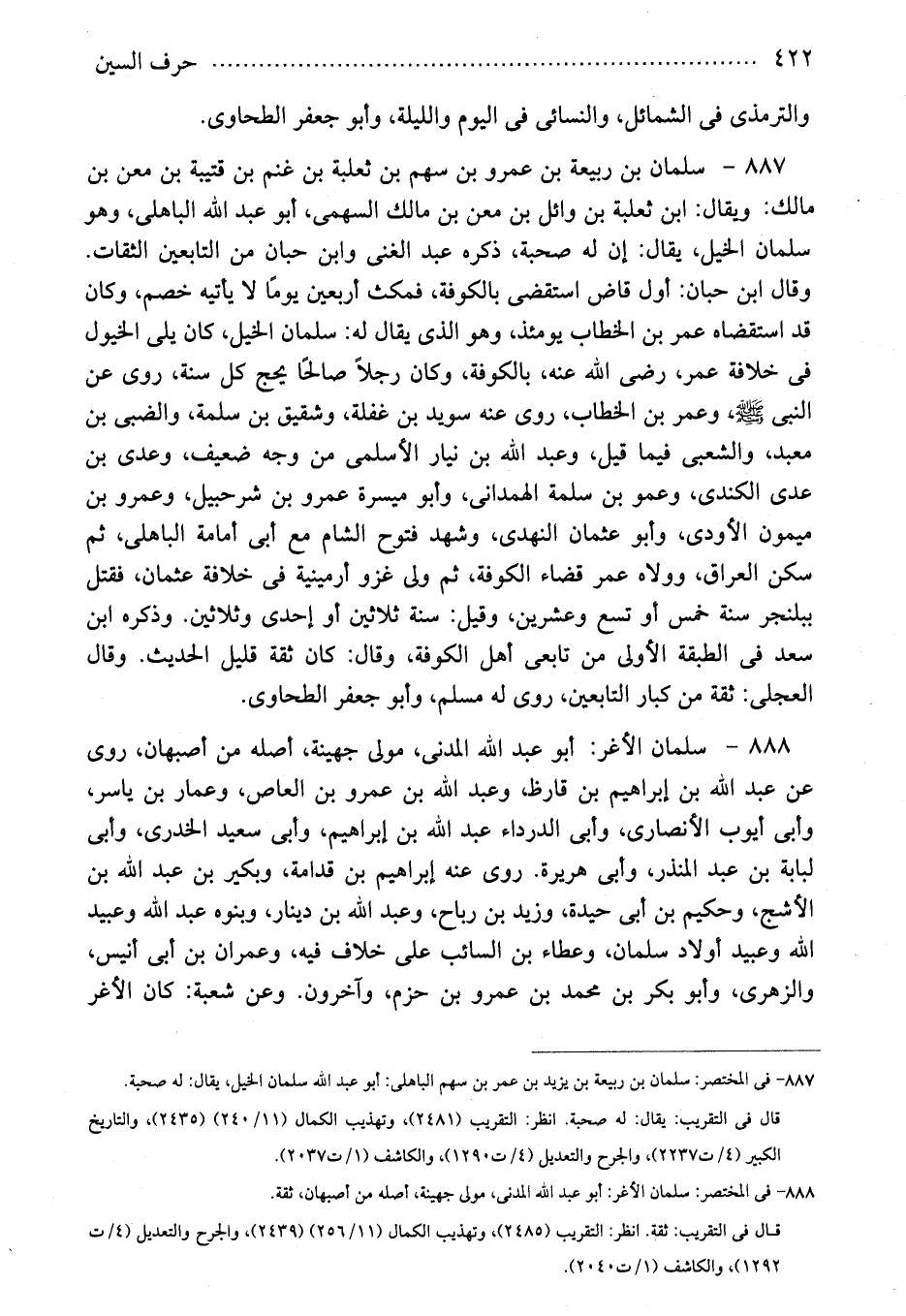 888 - سلمان الأغر: أبو عبد الله المدنى، مولى جهينة، أصله من أصبهان، روى عن عبد الله بن إبراهيم بن قارظ، وعبد الله بن عمرو بن العاص، وعمار بن ياسر، وأبى أيوب الأنصارى، وأبى الدرداء عبد الله بن إبراهيم، وأبى سعيد الخدرى، وأبى لبابة بن عبد المنذر، وأبى هريرة. روى عنه إبراهيم بن قدامة، وبكير بن عبد الله بن الأشج، وحكيم بن أبى حيدة، وزيد بن رباح، وعبد الله بن دينار، وبنوه عبد الله وعبيد الله وعبيد أولاد سلمان، وعطاء بن السائب على خلاف فيه، وعمران بن أبى أنيس، والزهرى، وأبو بكر بن محمد بن عمرو بن حزم، وآخرون. وعن شعبة: كان الأغر