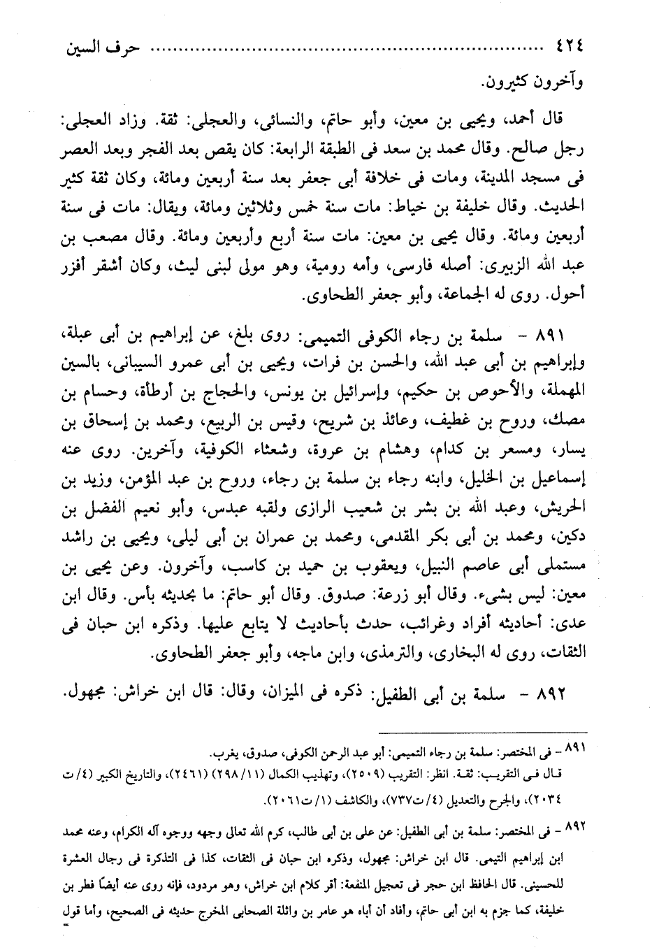 892 - فى المختصر: سلمة بن أبى الطفيل: عن على بن أبى طالب، كرم الله تعالى وجهه ووجوه آله الكرام، وعنه محمد بن إبراهيم التيمى. قال ابن خراش: مجهول، وذكره ابن حبان فى الثقات، كذا فى التذكرة فى رجال العشرة للحسينى. قال الحافظ ابن حجر فى تعجيل المنفعة: أقر كلام ابن خراش، وهو مردود، فإنه روى عنه أيضًا فطر بن خليفة، كما جزم به ابن أبى حاتم، وأفاد أن أباه هو عامر بن واثلة الصحابى المخرج حديثه فى الصحيح، وأما قول