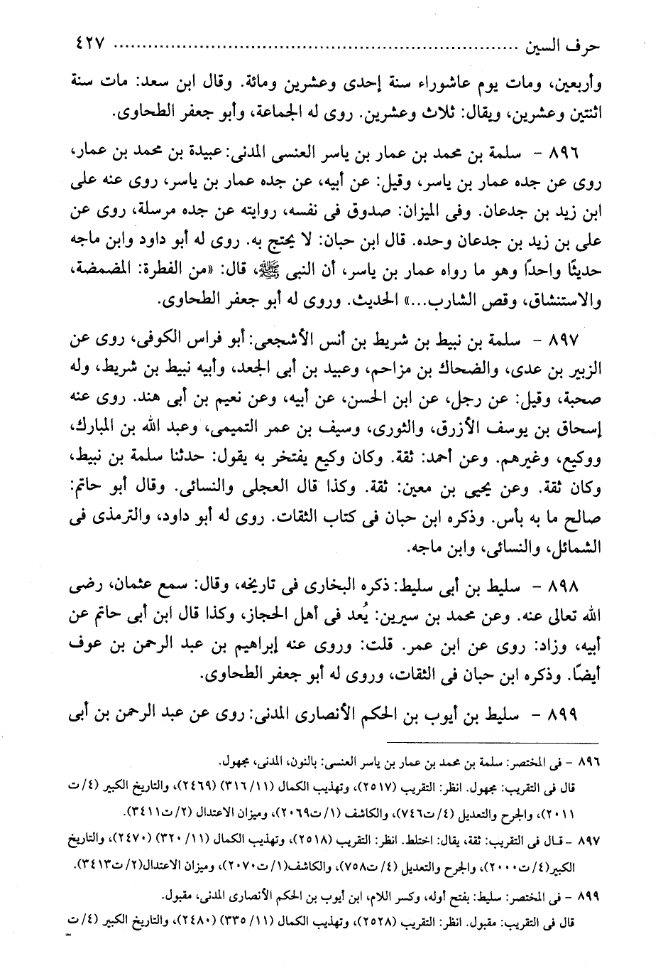898 - سليط بن أبى سليط: ذكره البخارى فى تاريخه، وقال: سمع عثمان، رضى الله تعالى عنه. وعن محمد بن سيرين: يُعد فى أهل الحجاز، وكذا قال ابن أبى حاتم عن أبيه، وزاد: روى عن ابن عمر. قلت: وروى عنه إبراهيم بن عبد الرحمن بن عوف أيضًا. وذكره ابن حبان فى الثقات، وروى له أبو جعفر الطحاوى.