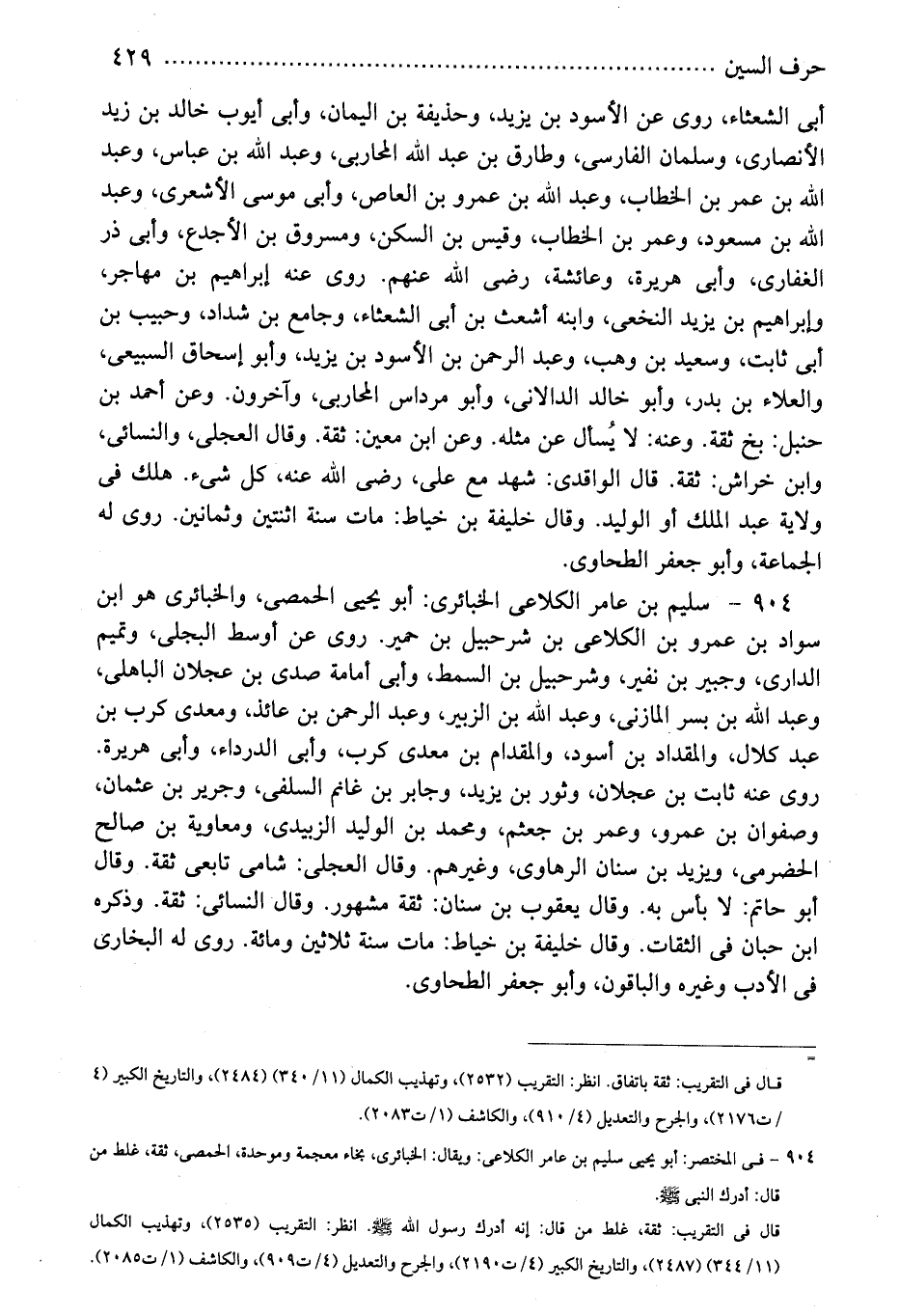904 - سليم بن عامر الكلاعى الخبائرى: أبو يحيى الحمصى، والخبائرى هو ابن سواد بن عمرو بن الكلاعى بن شرحبيل بن حمير. روى عن أوسط البجلى، وتميم الدارى، وجبير بن نفير، وشرحبيل بن السمط، وأبى أمامة صدى بن عجلان الباهلى، وعبد الله بن بسر المازنى، وعبد الله بن الزبير، وعبد الرحمن بن عائذ، ومعدى كرب بن عبد كلال، والمقداد بن أسود، والمقدام بن معدى كرب، وأبى الدرداء، وأبى هريرة. روى عنه ثابت بن عجلان، وثور بن يزيد، وجابر بن غانم السلفى، وجرير بن عثمان، وصفوان بن عمرو، وعمر بن جعثم، ومحمد بن الوليد الزبيدى، ومعاوية بن صالح الحضرمى، ويزيد بن سنان الرهاوى، وغيرهم. وقال العجلى: شامى تابعى ثقة. وقال أبو حاتم: لا بأس به. وقال يعقوب بن سنان: ثقة مشهور. وقال النسائى: ثقة. وذكره ابن حبان فى الثقات. وقال خليفة بن خياط: مات سنة ثلاثين ومائة. روى له البخارى فى الأدب وغيره والباقون، وأبو جعفر الطحاوى.