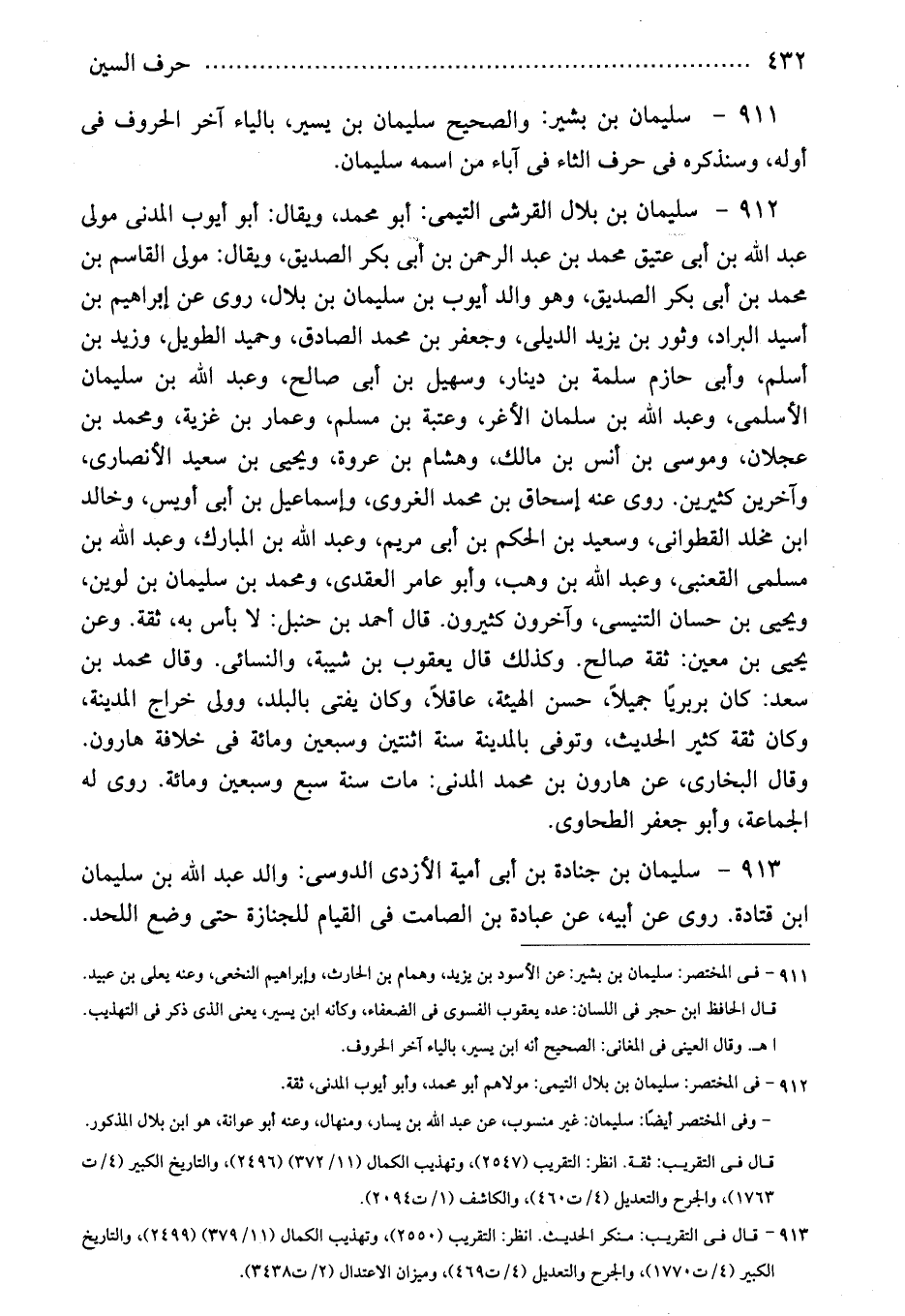 912 - فى المختصر: سليمان بن بلال التيمى: مولاهم أبو محمد، وأبو أيوب المدنى، ثقة.