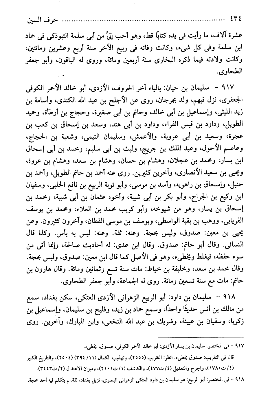917 - سليمان بن حيان: بالياء آخر الحروف، الأزدى، أبو خالد الأحمر الكوفى الجعفرى، نزل فيهم، ولد بجرجان، روى عن الأجلح بن عبد الله الكندى، وأسامة بن زيد الليثى، وإسماعيل بن أبى خالد، وحاتم بن أبى صغيرة، وحجاج بن أرطأة، وحميد الطويل، وداود بن قيس الفراء، وداود بن أبى هند، وسعد بن إسحاق بن كعب بن عجرة، وسعيد بن أبى عروبة، والأعمش، وسليمان التيمى، وشعبة بن الحجاج، وعاصم الأحول، وعبد الملك بن جريج، وليث بن أبى سليم، ومحمد بن أبى إسحاق ابن يسار، ومحمد بن عجلان، وهشام بن حسان، وهشام بن سعد، وهشام بن عروة، ويحيى بن سعيد الأنصارى، وآخرين كثيرين. روى عنه أحمد بن حاتم الطويل، وأحمد بن حنبل، وإسحاق بن راهويه، وأسد بن موسى، وأبو توبة الربيع بن نافع الحلبى، وسفيان ابن وكيع بن الجراح، وأبو بكر بن أبى شيبة، وأخوه عثمان بن أبى شيبة، ومحمد بن إسحاق بن يسار، وهو من شيوخه، وأبو كريب محمد بن العلاء، ومحمد بن يوسف الفريابى، ووهب بن بقية الواسطى، ويوسف بن موسى القطان، وآخرون كثيرون. وعن يحيى بن معين: صدوق، وليس بحجة. وعنه: ثقة. وعنه: ليس به بأس. وكذا قال النسائى. وقال أبو حاتم: صدوق. وقال ابن عدى: له أحاديث صالحة، وإنما أتى من سوء حفظه، فيغلط ويخطىء، وهو فى الأصل كما قال ابن معين: صدوق، وليس بحجة. وقال محمد بن سعد، وخليفة بن خياط: مات سنة تسع وثمانين ومائة. وقال هارون بن حاتم: مات مع سنة تسعين ومائة. روى له الجماعة، وأبو جعفر الطحاوى.