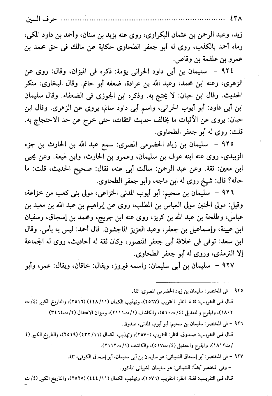 925 - سليمان بن زياد الحضرمى المصرى: سمع عبد الله بن الحارث بن جزء الزبيدى، روى عنه ابنه عوف بن سليمان، وعمرو بن الحارث، وابن لهيعة. وعن يحيى ابن معين: ثقة. وعن عبد الرحمن: سألت أبى عنه، فقال: صحيح الحديث، قلت: ما حاله؟ قال: شيخ روى له ابن ماجه، وأبو جعفر الطحاوى.