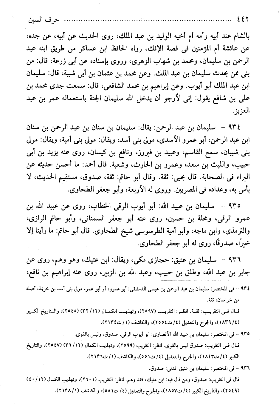 934 - سليمان بن عبد الرحمن: يقال: سليمان بن سنان بن عبد الرحمن بن سنان ابن عبد الرحمن، أبو عمرو الأسدى، مولى بنى أسد، ويقال: مولى بنى أمية، ويقال: مولى بنى شيبان، سمع القاسم، وعبيد بن فيروز، ونافع بن كيسان، روى عنه يزيد بن أبى حبيب، والليث بن سعد، وعمرو بن الحارث، وشعبة. قال أحمد: ما أحسن حديثه عن البراء فى الصحابة. قال يحيى: ثقة. وقال أبو حاتم: ثقة، صدوق، مستقيم الحديث، لا بأس به، وعداده فى المصريين. وروى له الأربعة، وأبو جعفر الطحاوى.