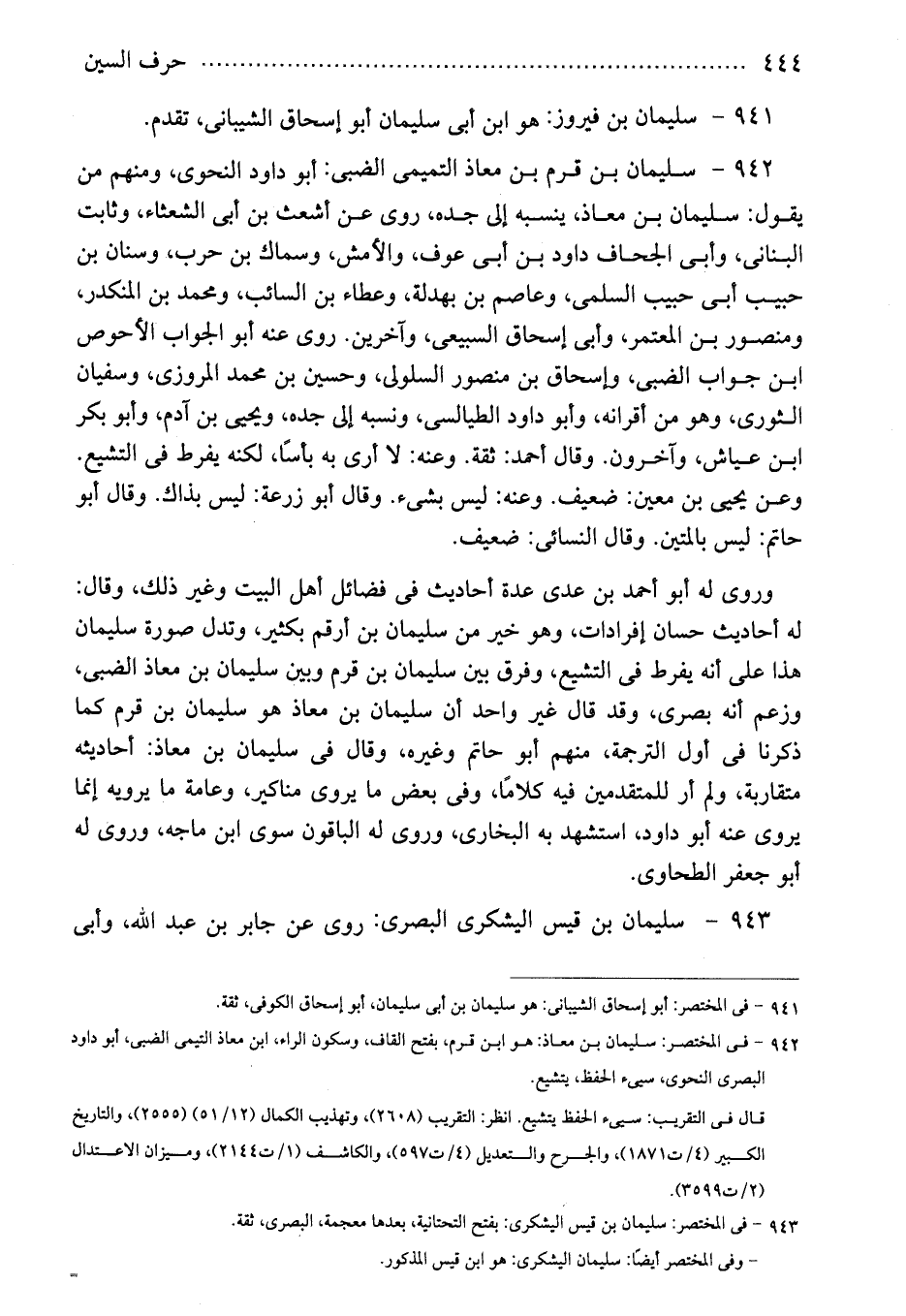 942 - سليمان بن قرم بن معاذ التميمى الضبى: أبو داود النحوى، ومنهم من يقول: سليمان بن معاذ، ينسبه إلى جده، روى عن أشعث بن أبى الشعثاء، وثابت البنانى، وأبى الجحاف داود بن أبى عوف، والأ'مش، وسماك بن حرب، وسنان بن حبيب أبى حبيب السلمى، وعاصم بن بهدلة، وعطاء بن السائب، ومحمد بن المنكدر، ومنصور بن المعتمر، وأبى إسحاق السبيعى، وآخرين. روى عنه أبو الجواب الأحوص ابن جواب الضبى، وإسحاق بن منصور السلولى، وحسين بن محمد المروزى، وسفيان الثورى، وهو من أقرانه، وأبو داود الطيالسى، ونسبه إلى جده، ويحيى بن آدم، وأبو بكر ابن عياش، وآخرون. وقال أحمد: ثقة. وعنه: لا أرى به بأسًا، لكنه يفرط فى التشيع. وعن يحيى بن معين: ضعيف. وعنه: ليس بشىء. وقال أبو زرعة: ليس بذاك. وقال أبو حاتم: ليس بالمتين. وقال النسائى: ضعيف.