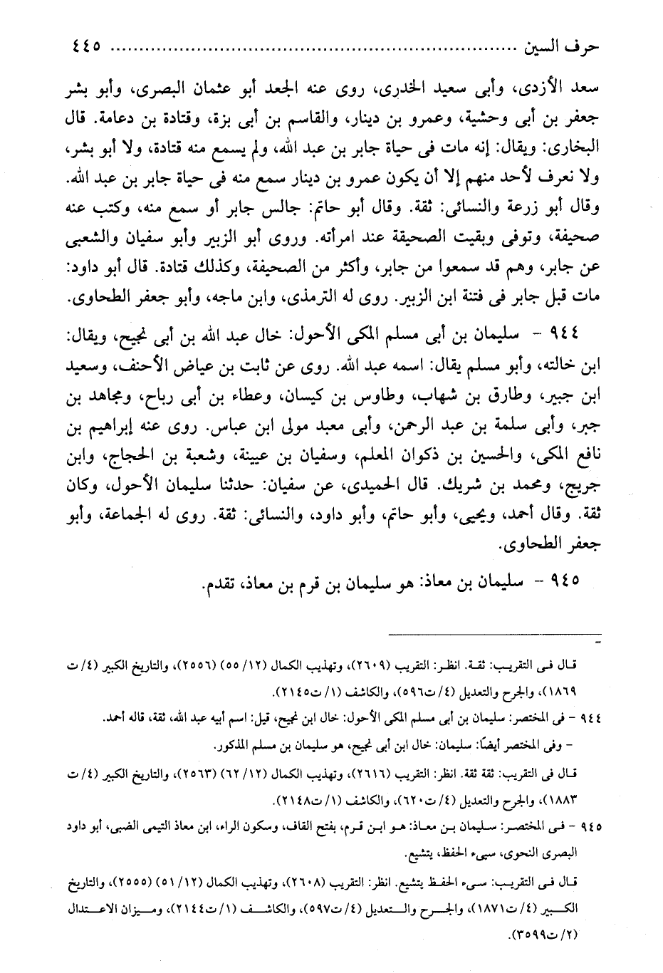 944 - سليمان بن أبى مسلم المكى الأحول: خال عبد الله بن أبى نجيح، ويقال: ابن خالته، وأبو مسلم يقال: اسمه عبد الله. روى عن ثابت بن عياض الأحنف، وسعيد ابن جبير، وطارق بن شهاب، وطاووس بن كيسان، وعطاء بن أبى رباح، ومجاهد بن جبر، وأبى سلمة بن عبد الرحمن، وأبى معبد مولى ابن عباس. روى عنه إبراهيم بن نافع المكى، والحسين بن ذكوان المعلم، وسفيان بن عيينة، وشعبة بن الحجاج، وابن جريج، ومحمد بن شريك. قال الحميدى، عن سفيان: حدثنا سليمان الأحول، وكان ثقة. وقال أحمد، ويحيى، وأبو حاتم، وأبو داود، والنسائى: ثقة. روى له الجماعة، وأبو جعفر الطحاوى.