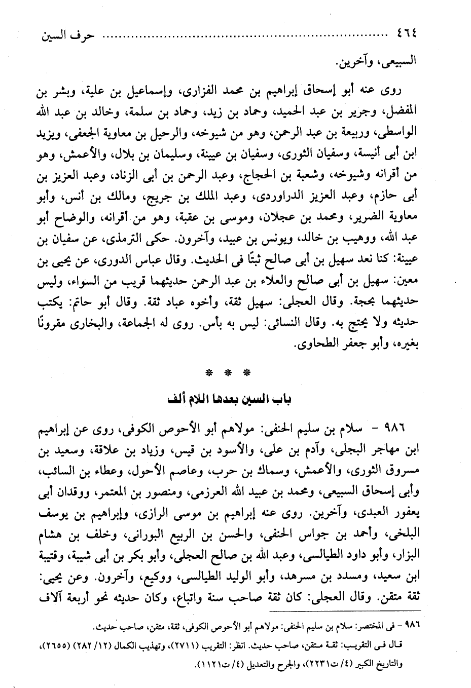 986 - فى المختصر: سلام بن سليم الحنفى: مولاهم أبو الأحوص الكوفى، ثقة، متقن، صاحب حديث.