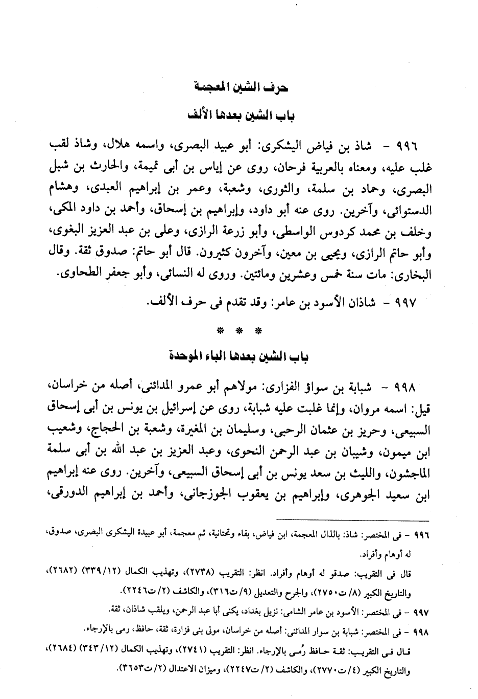997 - فى المختصر: الأسود بن عامر الشامى: نزيل بغداد، يكنى أبا عبد الرحمن، ويلقب شاذان، ثقة.