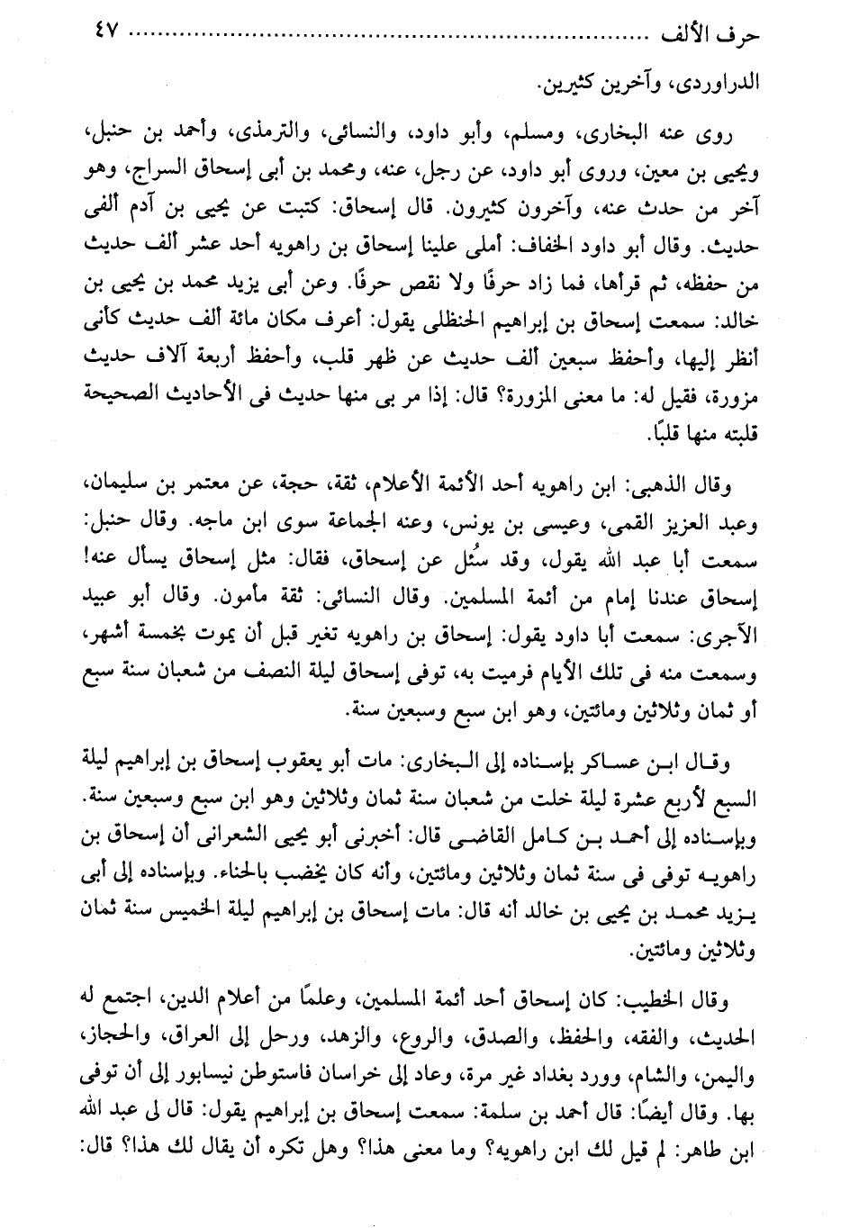 وقال الذهبى: ابن راهويه أحد الأئمة الأعلام، ثقة، حجة، عن معتمر بن سليمان، وعبد العزيز القمى، وعيسى بن يونس، وعنه الجماعة سوى ابن ماجه. وقال حنبل: سمعت أبا عبد الله يقول، وقد سُئل عن إسحاق، فقال: مثل إسحاق يسأل عنه! إسحاق عندنا إمام من أئمة المسلمين. وقال النسائى: ثقة مأمون. وقال أبو عبيد الآجرى: سمعت أبا داود يقول: إسحاق بن راهويه تغير قبل أن يموت بخمسة أشهر، وسمعت منه فى تلك الأيام فرميت به، توفى إسحاق ليلة النصف من شعبان سنة سبع أو ثمان وثلاثين ومائتين، وهو ابن سبع وسبعين سنة.