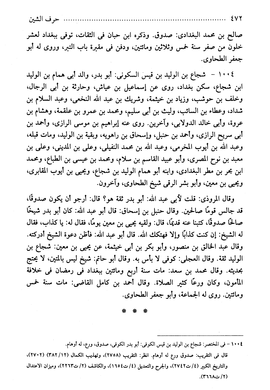 1004 - شجاع بن الوليد بن قيس السكونى: أبو بدر، والد أبى همام بن الوليد ابن شجاع، سكن بغداد، روى عن إسماعيل بن عياش، وحارثة بن أبى الرجال، وخلف بن حوشب، وزياد بن خيثمة، وشريك بن عبد الله النخعى، وعبد السلام بن شداد، وعطاء بن السائب، وليث بن أبى سليم، ومحمد بن عمرو بن علقمة، وهشام بن عروة، وأبى خالد الدولابى، وآخرين. روى عنه إبراهيم بن موسى الرازى، وأحمد بن أبى سريح الرازى، وأحمد بن حنبل، وإسحاق بن راهويه، وبقية بن الوليد، ومات قبله، وعبد الله بن أيوب المخرمى، وعبد الله بن محمد النفيلى، وعلى بن المدينى، وعلى بن معبد بن نوح المصرى، وأبو عبيد القاسم بن سلام، ومحمد بن عيسى بن الطباع، ومحمد ابن بحر بن مطر البغدادى، وابنه أبو همام الوليد بن شجاع، ويحيى بن أيوب المقابرى، ويحيى بن معين، وأبو بشر الرقى شيخ الطحاوى، وآخرون.