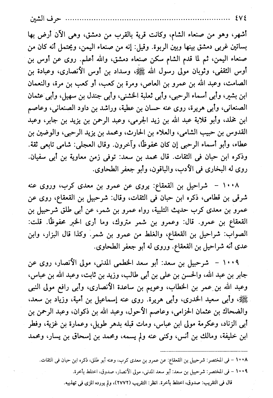 1009 - شرحبيل بن سعد: أبو سعد الخطمى المدنى، مولى الأنصار، روى عن جابر بن عبد الله، والحسن بن على بن أبى طالب، وزيد بن ثابت، وعبد الله بن عباس، وعبد الله بن عمر بن الخطاب، وعويم بن ساعدة الأنصارى، وأبى رافع مولى النبى - صلى الله عليه وسلم -، وأبى سعيد الخدرى، وأبى هريرة. روى عنه إسماعيل بن أمية، وزياد بن سعد، والضحاك بن عثمان الحزامى، وعاصم الأحول، وعبد الله بن ذكوان، وعبد الرحمن بن أبى الزناد، وعكرمة مولى ابن عباس، ومات قبله بدهر طويل، وعمارة بن غزية، وفطر ابن خليفة، ومالك بن أنس، وكنى عنه ولم يسمه، ومحمد بن إسحاق بن يسار، ومحمد