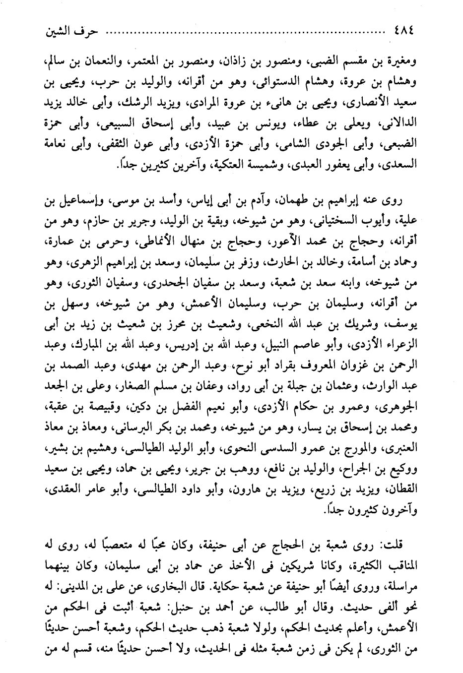 قلت: روى شعبة بن الحجاج عن أبى حنيفة، وكان محبًا له متعصبًا له، روى له المناقب الكثيرة، وكانا شريكين فى الأخذ عن حماد بن أبى سليمان، وكان بينهما مراسلة، وروى أيضًا أبو حنيفة عن شعبة حكاية. قال البخارى، عن على بن المدينى: له نحو ألفى حديث. وقال أبو طالب، عن أحمد بن حنبل: شعبة أثبت فى الحكم من الأعمش، وأعلم بحديث الحكم، ولولا شعبة ذهب حديث الحكم، وشعبة أحسن حديثًا من الثورى، لم يكن فى زمن شعبة مثله فى الحديث، ولا أحسن حديثًا منه، قسم له من