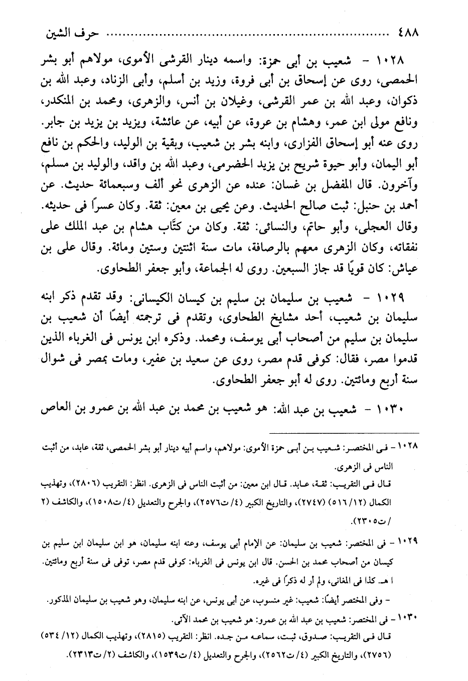 1028 - فى المختصر: شعيب بن أبى حمزة الأموى: مولاهم، واسم أبيه دينار أبو بشر الحمصى، ثقة، عابد، من أثبت الناس فى الزهرى.