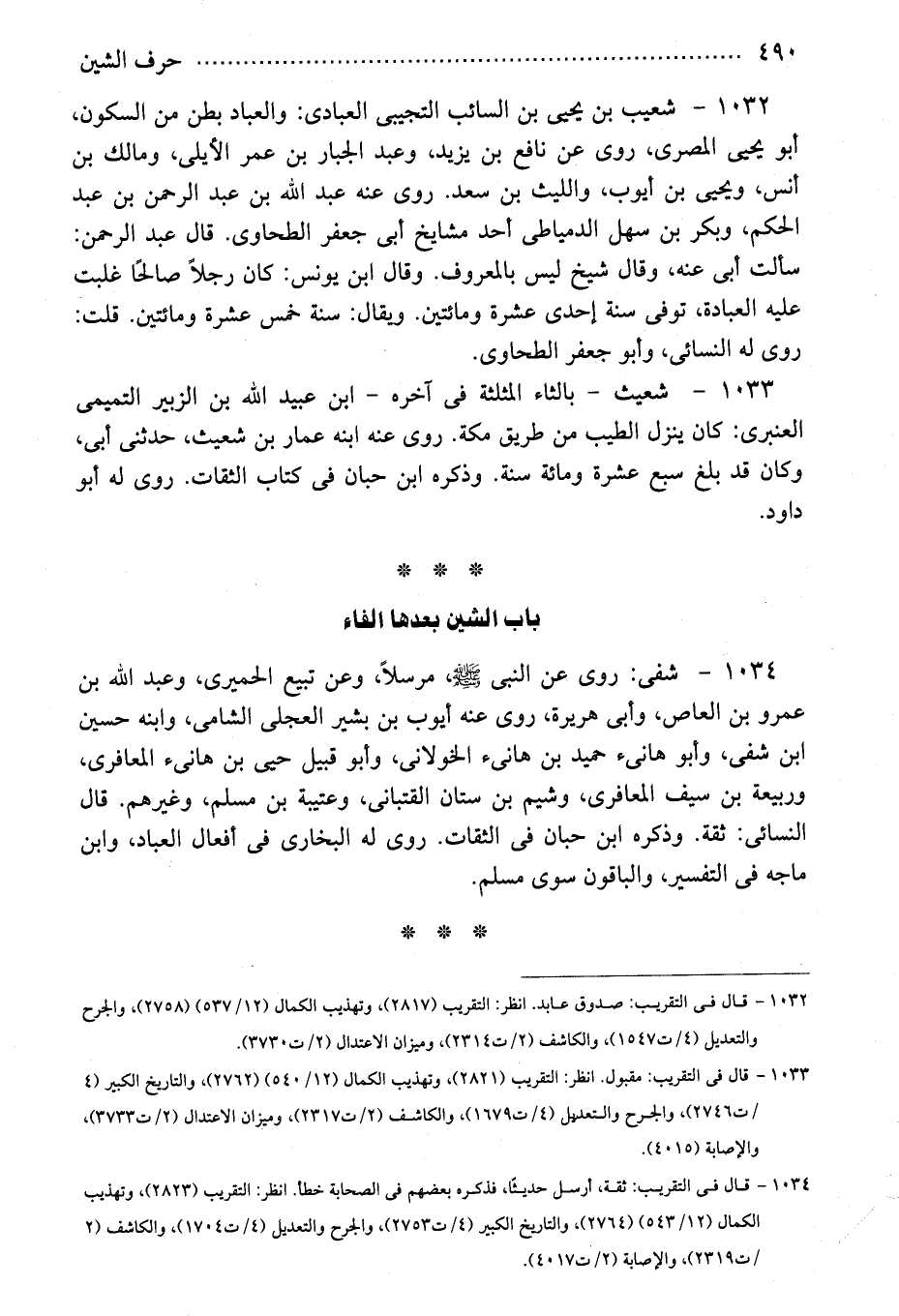 1034 - شفى: روى عن النبى - صلى الله عليه وسلم -، مرسلاً، وعن تبيع الحميرى، وعبد الله بن عمرو بن العاص، وأبى هريرة، روى عنه أيوب بن بشير العجلى الشامى، وابنه حسين ابن شفى، وأبو هانىء حميد بن هانىء الخولانى، وأبو قبيل حيى بن هانىء المعافرى، وربيعة بن سيف المعافرى، وشيم بن ستان القتبانى، وعتيبة بن مسلم، وغيرهم. قال النسائى: ثقة. وذكره ابن حبان فى الثقات. روى له البخارى فى أفعال العباد، وابن ماجه فى التفسير، والباقون سوى مسلم.