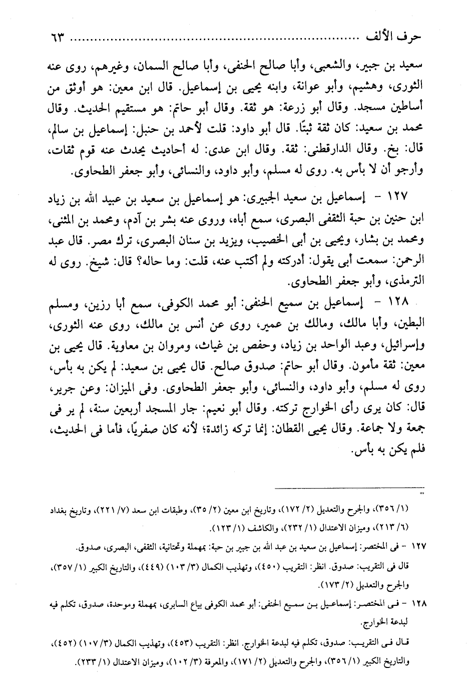 127 - إسماعيل بن سعيد الجبيرى: هو إسماعيل بن سعيد بن عبيد الله بن زياد ابن حنين بن حبة الثقفى البصرى، سمع أباه، وروى عنه بشر بن آدم، ومحمد بن المثنى، ومحمد بن بشار، ويحيى بن أبى الخصيب، ويزيد بن سنان البصرى، ترك مصر. قال عبد الرحمن: سمعت أبى يقول: أدركته ولم أكتب عنه، قلت: وما حاله؟ قال: شيخ. روى له الترمذى، وأبو جعفر الطحاوى.