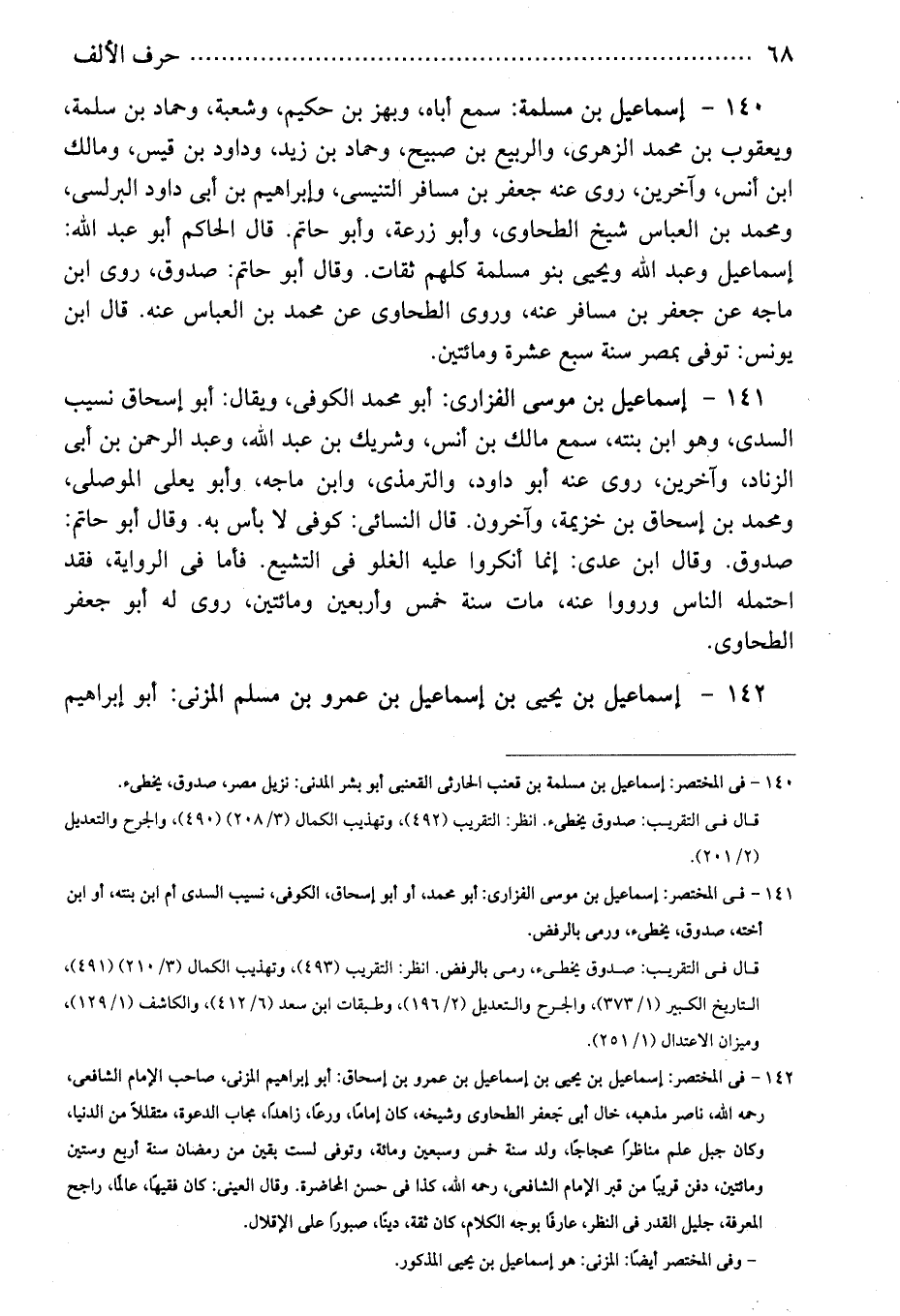 142 - فى المختصر: إسماعيل بن يحيى بن إسماعيل بن عمرو بن إسحاق: أبو إبراهيم المزنى، صاحب الإمام الشافعى، رحمه الله، ناصر مذهبه، خال أبى جعفر الطحاوى وشيخه، كان إمامًا، ورعًا، زاهدًا، مجاب الدعوة، متقللاً من الدنيا، وكان جبل علم مناظرًا محجاجًا، ولد سنة خمس وسبعين ومائة، وتوفى لست بقين من رمضان سنة أربع وستين ومائتين، دفن قريبًا من قبر الإمام الشافعى، رحمه الله، كذا فى حسن المحاضرة. وقال العينى: كان فقيهًا، عالمًا، راجح المعرفة، جليل القدر فى النظر، عارفًا بوجه الكلام، كان ثقة، دينًا، صبورًا على الإقلال.