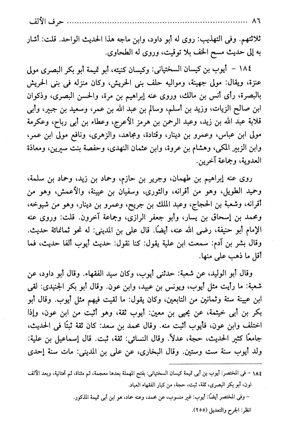 184 - أيوب بن كيسان السختيانى: وكيسان كنيته، أبو تميمة أبو بكر البصرى مولى عنزة، ويقال: مولى جهينة، ومواليه حلف بنى الحريش، وكان منزله فى بنى الحريش بالبصرة، رأى أنس بن مالك، وروى عنه إبراهيم بن مرة، والحسن البصرى، وذكوان ابن صالح الزيات، وزيد بن أسلم، وسالم بن عبد الله بن عمر، وسعيد بن جبير، وأبى قلابة عبد الله بن زيد، وعبد الرحمن بن هرمز الأعرج، وعطاء بن أبى رباح، وعكرمة مولى ابن عباس، وعمرو بن دينار، وقتادة، ومجاهد، والزهرى، ونافع مولى ابن عمر، وابن الزبير المكى، وهشام بن عروة، وابن عثمان النهدى، وحفصة بنت سيرين، ومعاذة العدوية، وجماعة آخرين.