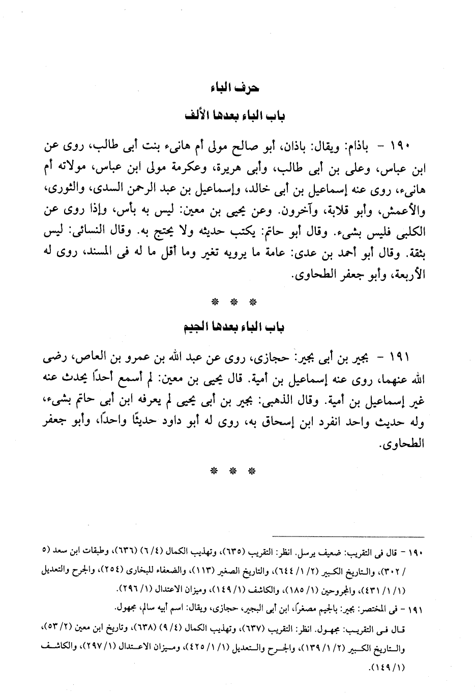 190 - باذام: ويقال: باذان، أبو صالح مولى أم هانىء بنت أبى طالب، روى عن ابن عباس، وعلى بن أبى طالب، وأبى هريرة، وعكرمة مولى ابن عباس، مولاته أم هانىء، روى عنه إسماعيل بن أبى خالد، وإسماعيل بن عبد الرحمن السدى، والثورى، والأعمش، وأبو قلابة، وآخرون. وعن يحيى بن معين: ليس به بأس، وإذا روى عن الكلبى فليس بشىء. وقال أبو حاتم: يكتب حديثه ولا يحتج به. وقال النسائى: ليس بثقة. وقال أبو أحمد بن عدى: عامة ما يرويه تغير وما أقل ما له فى المسند، روى له الأربعة، وأبو جعفر الطحاوى.