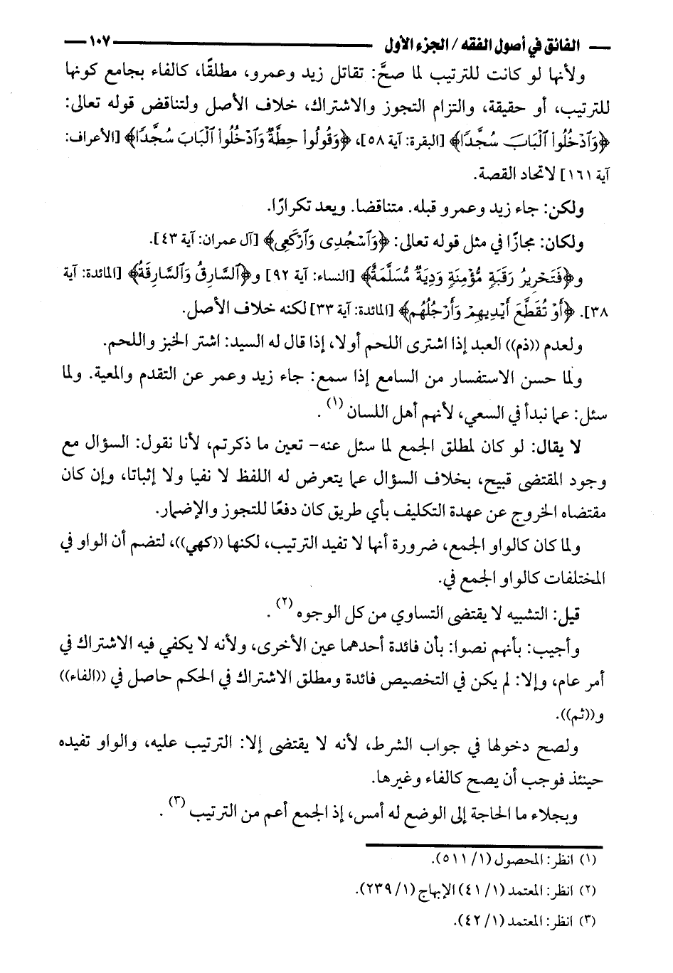 ولأنها لو كانت للترتيب لما صحَّ: تقاتل زيد وعمرو، مطلقًا، كالفاء بجامع كونها لترتيب أو حقيقة، والتزام التجوز والاشتراك، خلاف الأصل وتناقض قوله تعالى: {ادخلوا الباب سجدا} [البقرة: آية ٥٨]، {وقولوا حطة وادخلوا الباب سجدا} [الأعراف: آية ١٦١] لاتحاد القصة.