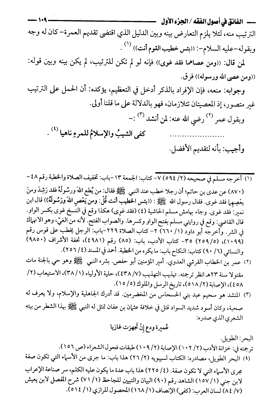 الترتيب منه، لئلا يلزم التعارض بينه وبين الدليل الذي اقتضى تقديم العمرة -كان له وجه وبقوله - عليه السلام -: "بئس خطيب القوم أنت".