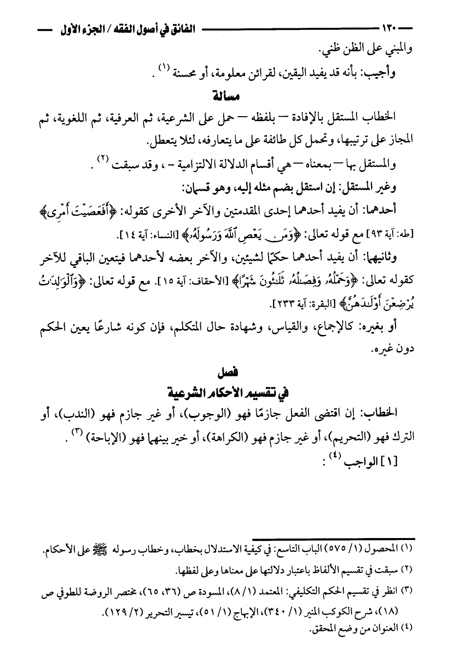 الخطاب: إن اقتضى الفعل جازمًا فهو (الوجوب)، أو غير جازم فهو (الندب)، أو الترك فهو (التحريم)، أو غير جازم فهو (الكراهة)، أو خير بينهما فهو (الإباحة).