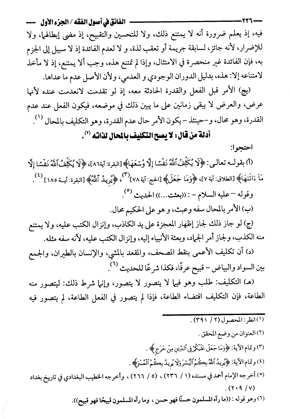 (د) أن تكليف الأعمى بنقط المصحف، والمقعد بالمشي، والإنسان بالطيران، والجمع بين السواد والبياض - قبيح عرفًا، فكذا شرعًا للحديث.
