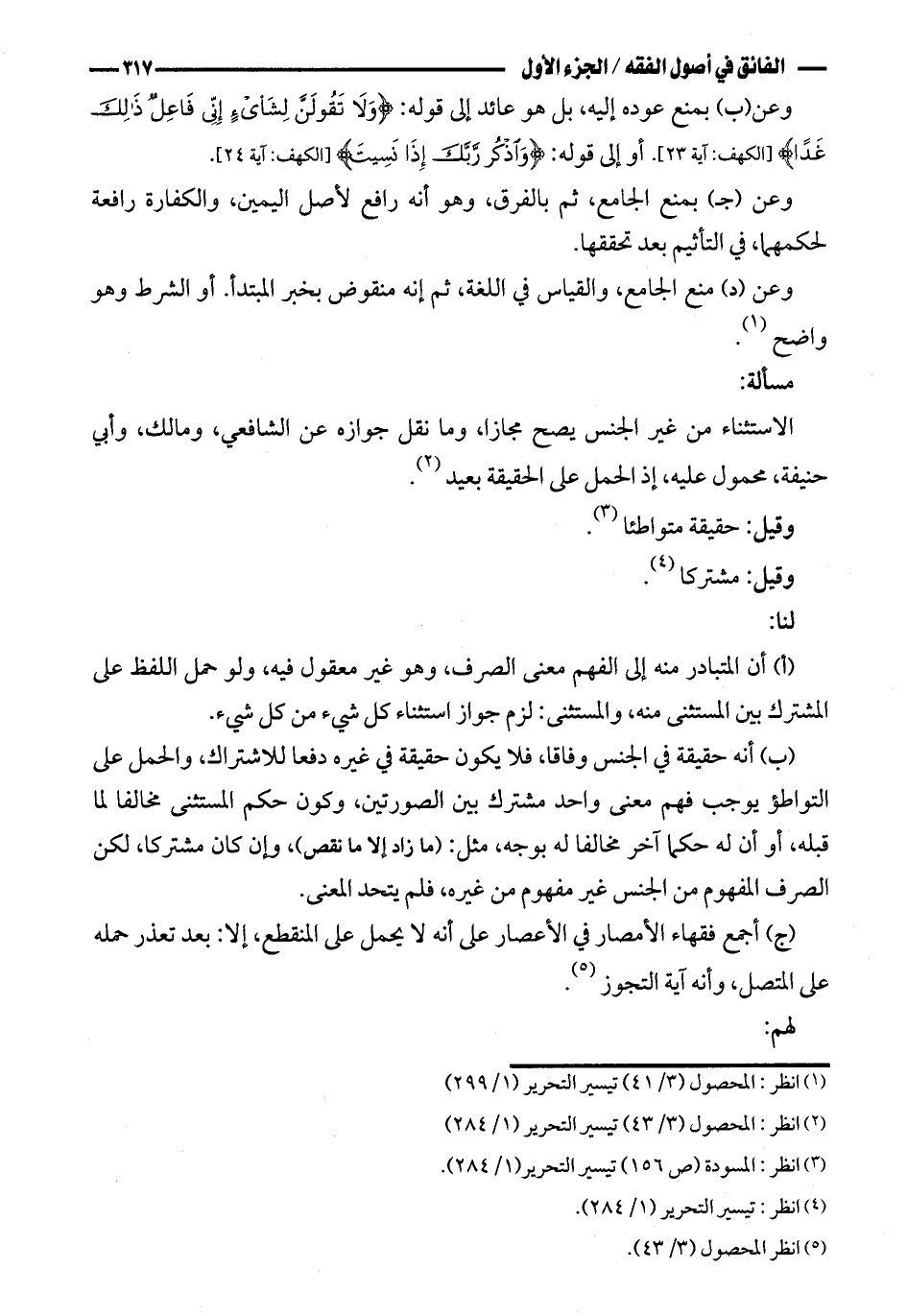 (ب) أنه حقيقة في الجنس وفاقا، فلا يكون حقيقة في غيره دفعا للاشتراك، والحمل على التواطؤ يوجب فهم معنى واحد مشترك بين الصورتين، وكون حكم المستثنى مخالفا لما قبله، أو أن له حكما آخر مخالفا له بوجه، مثل: (ما زاد إلا ما نقص)، وإن كان مشتركا، لكن الصرف المفهوم من الجنس غير مفهوم من غيره، فلم يتحد المعنى.