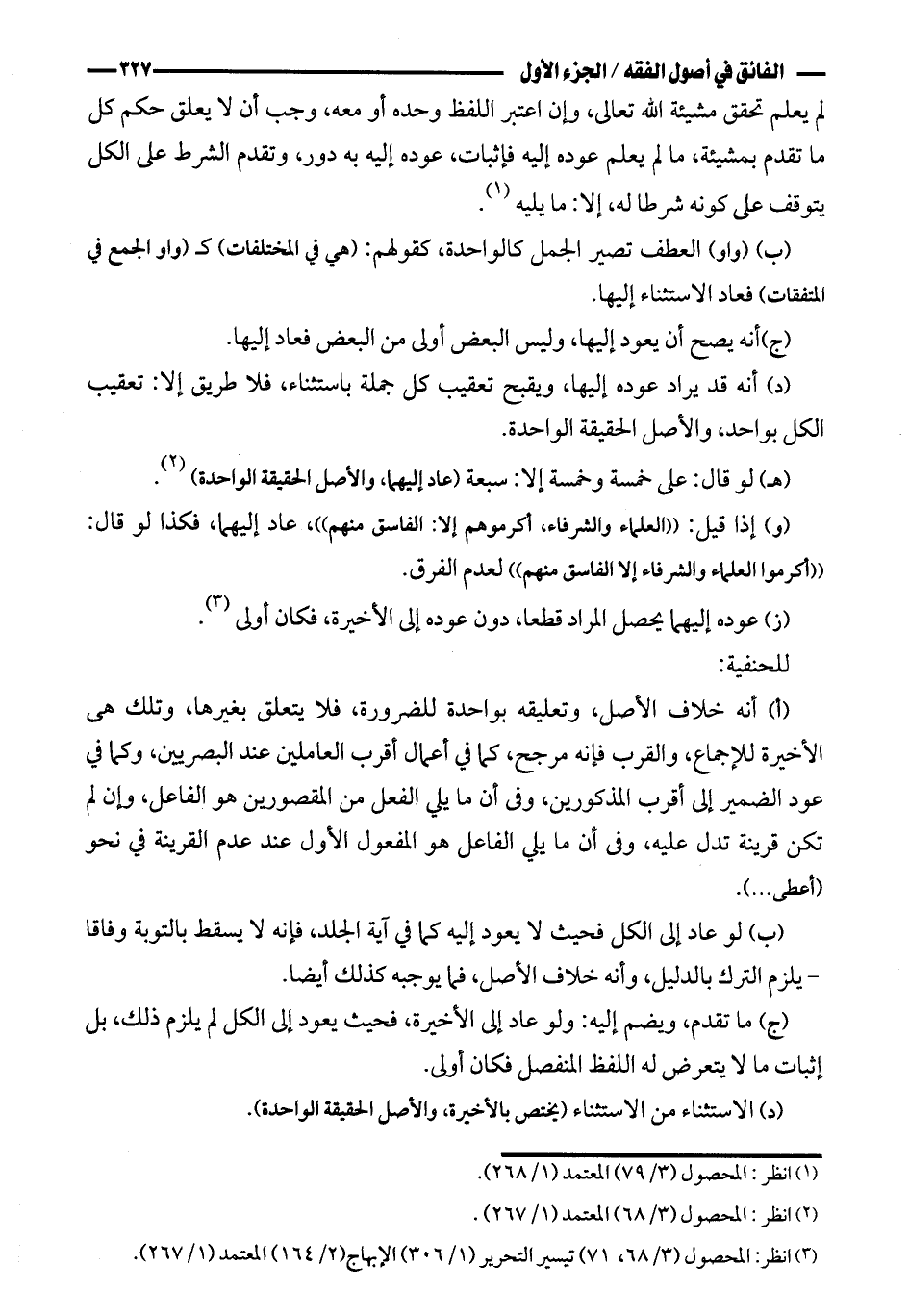 (د) أنه قد يراد عوده إليها، ويقبح تعقيب كل جملة باستثناء، فلا طريق إلا: تعقيب الكل بواحد، والأصل الحقيقة الواحدة.
