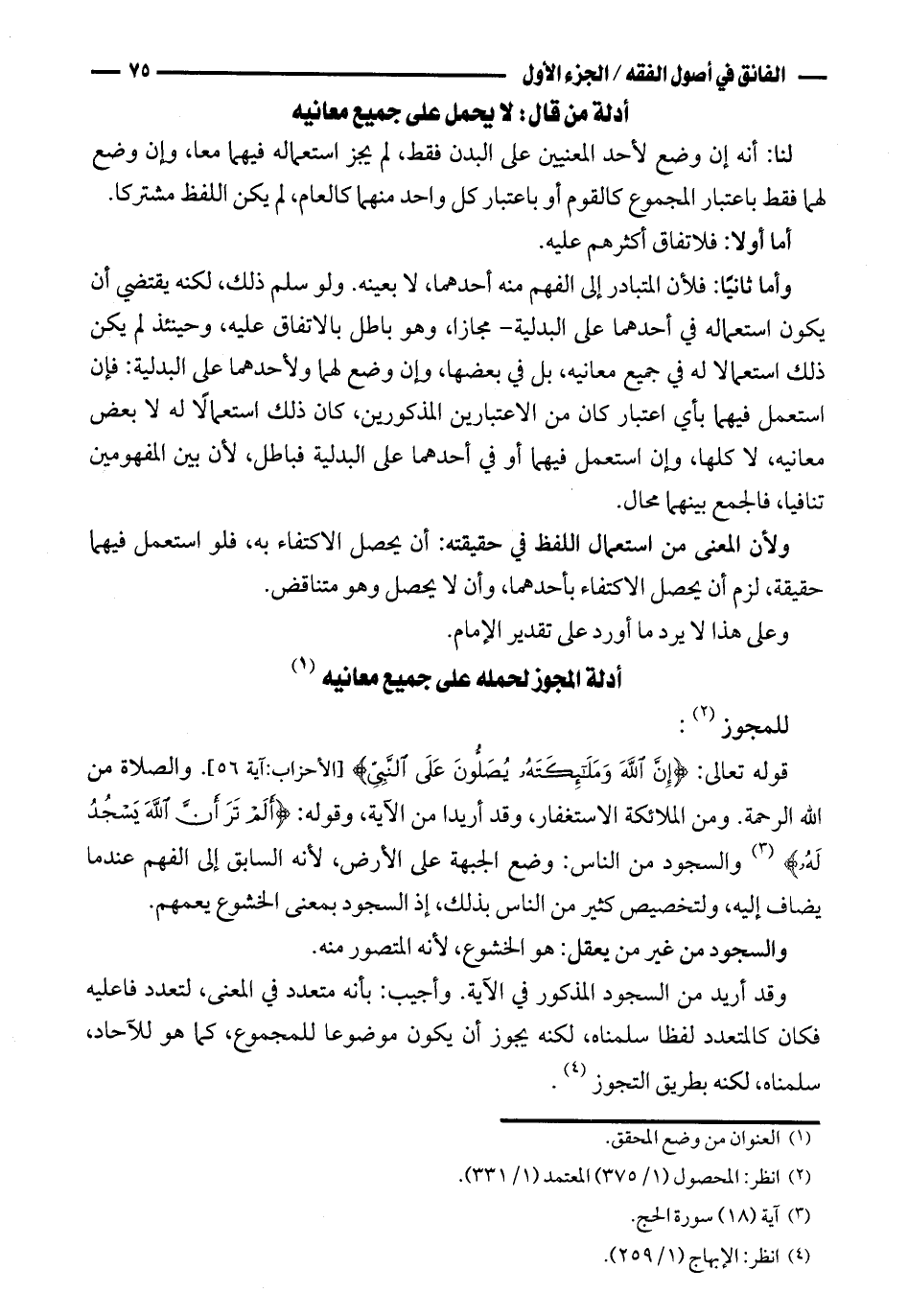 قوله تعالى: {إن الله وملائكته يصلون على النبي} [الأحزاب: آية ٥٦]. والصلاة من الله الرحمة. ومن الملائكة الاستغفار، وقد أريدا من الآية، وقوله: {ألم تر أن الله يسجد له} والسجود من الناس: وضع الجبهة على الأرض، لأنه السابق إلى الفهم عندما يضاف إليه، ولتخصيص كثير من الناس بذلك، إذ السجود بمعنى الخشوع يعمهم.