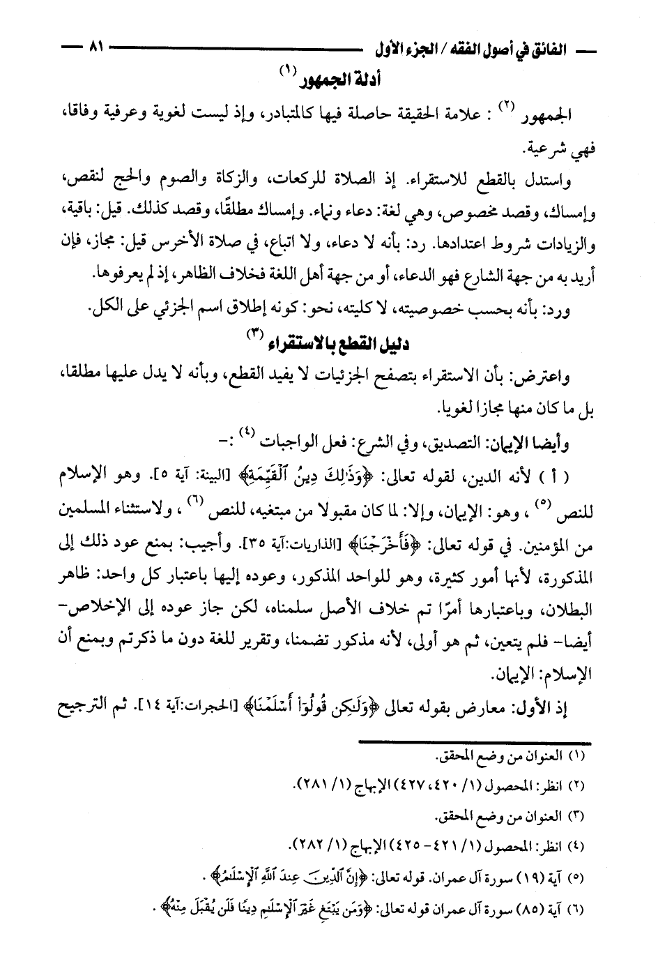 (أ) لأنه الدين، لقوله تعالى: {وذلك دين القيمة} [البينة: آية ٥]. وهو: الإيمان، وإلا: لما كان مقبولا من مبتغيه، للنص، ولاستثناء المسلمين من المؤمنين. في قوله تعالى: {فأخرجنا} [الذاريات: آية ٣٥]. وأجيب: بمنع عود ذلك إلى المذكورة، لأنها أمور كثيرة، وهو للواحد المذكور، وعوده إليها باعتبار كل واحد: ظاهر البطلان، وباعتبارها أمرًا تم خلاف الأصل سلمناه، لكن جاز عوده إلى الإخلاص -أيضا- فلم يتعين، ثم هو أولى، لأنه مذكور تصمنا، وتقرير لغة دون ما ذكرتم وبمنع أن الإسلام: الإيمان.