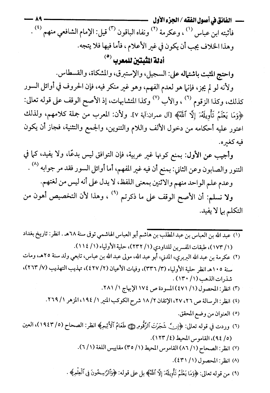 ولأنه لو لم يجز، فإنما هو لعدم الفهم، وهو غير منكر فيه، فإن الحروف في أوائل السور كذلك، وكذا الزقوم، والأب وكذا المتشابهات، إذ الأصح الوقف على قوله تعالى: {وما يعلم تأويله إلا الله} [آل عمران: آية ٧]. ولأن: المعرب من جملة كلامهم، ولذلك اعتور عليه أحكامه من دخول الألف واللام والتنوين، والجمع والتثنية، فجاز أن يكون فيه كغيره.