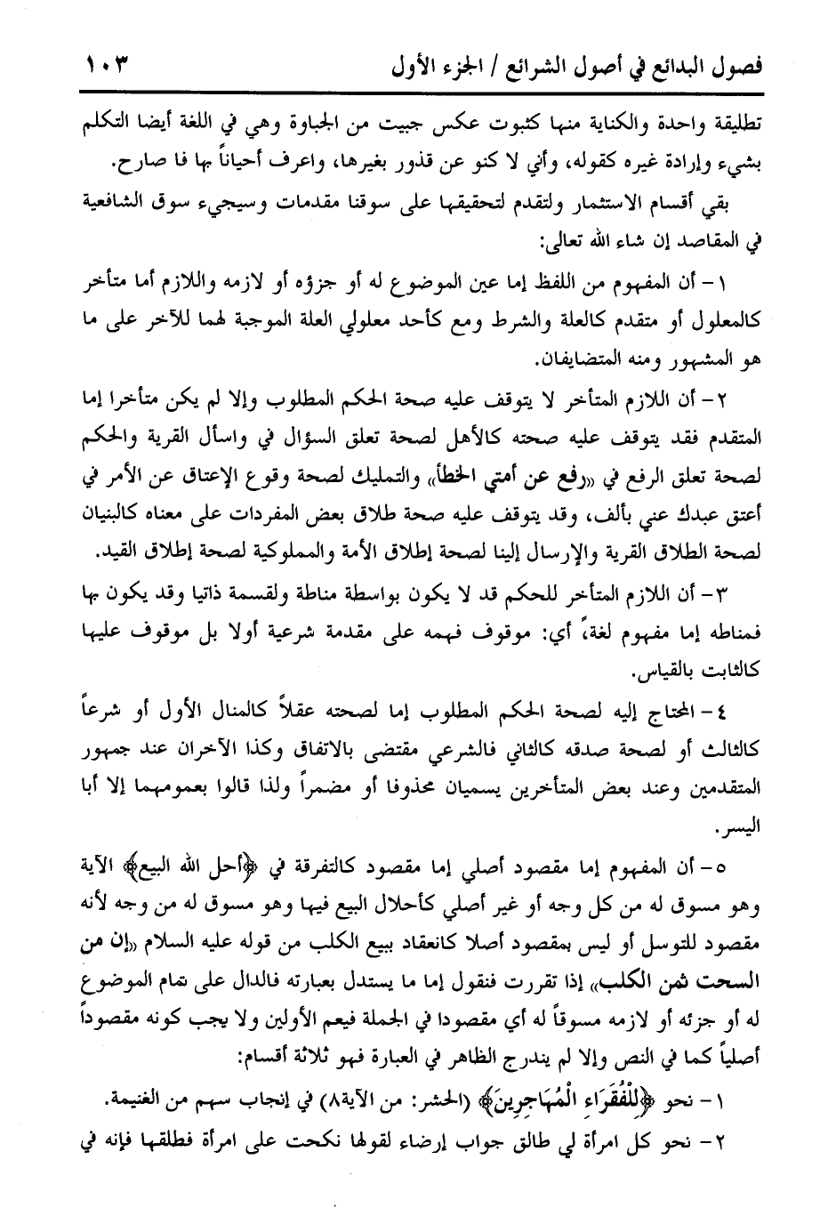 5 - أن المفهوم إما مقصود أصلى إما مقصود كالتفرقة في {أحل الله البيع} الآية وهو مسوق له من كل وجه أو غير أصلي كإحلال البيع فيها وهو مسوق له من وجه لأنه مقصود للتوسل أو ليس لمقصود أصلا كانعقاد ببيع الكلب من قوله عليه السلام "إن من السحت ثمن الكلب" إذا تقررت فنقول إما ما يستدل بعبارته فالدال على تمام الموضوع له أو جزئه أو لازمه مسوقًا له أي مقصودا في الجملة فيعم الأولين ولا يجب كونه مقصودًا أصليًا كما في النص وإلا لم يندرج الظاهر في العبارة فهو ثلاثة أقسام: