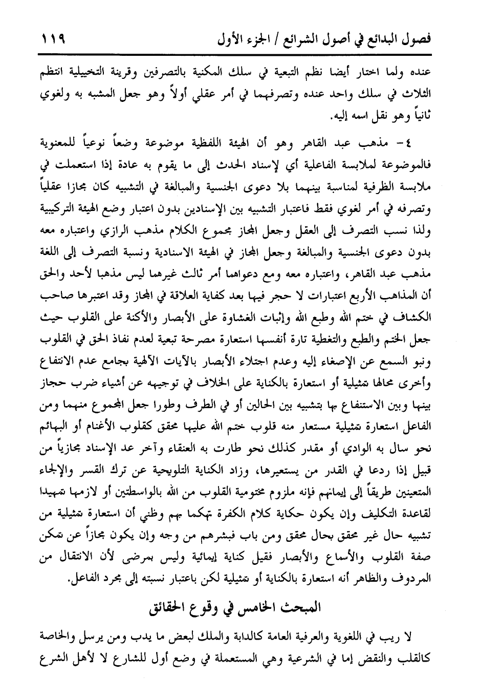 4 - مذهب عبد القاهر وهو أن الهيئة اللفطة موضوعة وضعاً نوعياً للمعنوية فالموضوعة لملابسة الفاعلية أي لإسناد الحدث إلى ما يقوم به عادة إذا استعملت في ملابسة الظرفية لمناسبة بينهما بلا دعوى الجنسية والمبالغة في التشبيه كان مجازا عقلياً وتصرفه في أمر لغوي فقط فاعتبار التشبيه بين الإسنادين بدون اعتبار وضع الهيئة التركيبية ولذا نسب التصرف إلى العقل وجعل المجاز مجموع الكلام مذهب الرازي واعتباره معه بدون دعوى الجنسية والمبالغة وجعل المجاز في الهيئة الاسنادية ونسبة التصرف إلى اللغة مذهب عبد القاهر، واعتباره معه ومع دعواهما أمر ثالث غيرهما ليس مذهبا لأحد والحق أن المذاهب الأربع اعتبارات لا حجر فيها بعد كفاية العلاقة في المجاز وقد اعتبرها صاحب الكشاف في ختم الله وطبع الله وإثبات الغشاوة على الأبصار والأكنة على القلوب حيث جعل الختم والطبع والتغطية تارة أنفسها استعارة مصرحة تبعية لعدم نفاذ الحق في القلوب ونبو السمع عن الإصغاء إليه وعدم اجتلاء الأبصار بالأيات الإلهية بجامع عدم الانتفاع وأخرى محالها تمثيلية أو استعارة بالكناية على الخلاف في توجيهه عن أشياء ضرب حجاز بينها وبين الاستنفاع بها بتشبيه بين الحالين أو في الطرف وطورا جعل المجموع منهما ومن الفاعل استعارة تمثيلية مستعار منه قلوب ختم الله عليها محقق كقلوب الأغنام أو البهائم نحو سأل به الوادي أو مقدر كذلك نحو طارت به العنقاء وآخر عد الإسناد مجازياً من قبيل إذا ردعا في القدر من يستعيرها، وزاد الكناية التلويحية عن ترك القسر والإلجاء المتعينين طريقاً إلى إيمانهم فإنه ملزوم مختومية القلوب من الله بالواسطين أو لازمها تمهيدا لقاعدة التكليف وإن يكون حكايته كلام الكفرة تهكما بهم وظني أن استعارة تمثيلية من تشبيه حال غير محقق بحال محقق ومن باب فبشرهم من وجه وإن يكون مجازاً عن تمكن صفة القلوب والأسماع والأبصار فقيل كناية إيمائية وليس يمرضى لأن الانتقال من المردوف والظاهر أنه استعارة بالكناية أو تمثيلية لكن باعتبار نسبته إلى مجرد الفاعل.