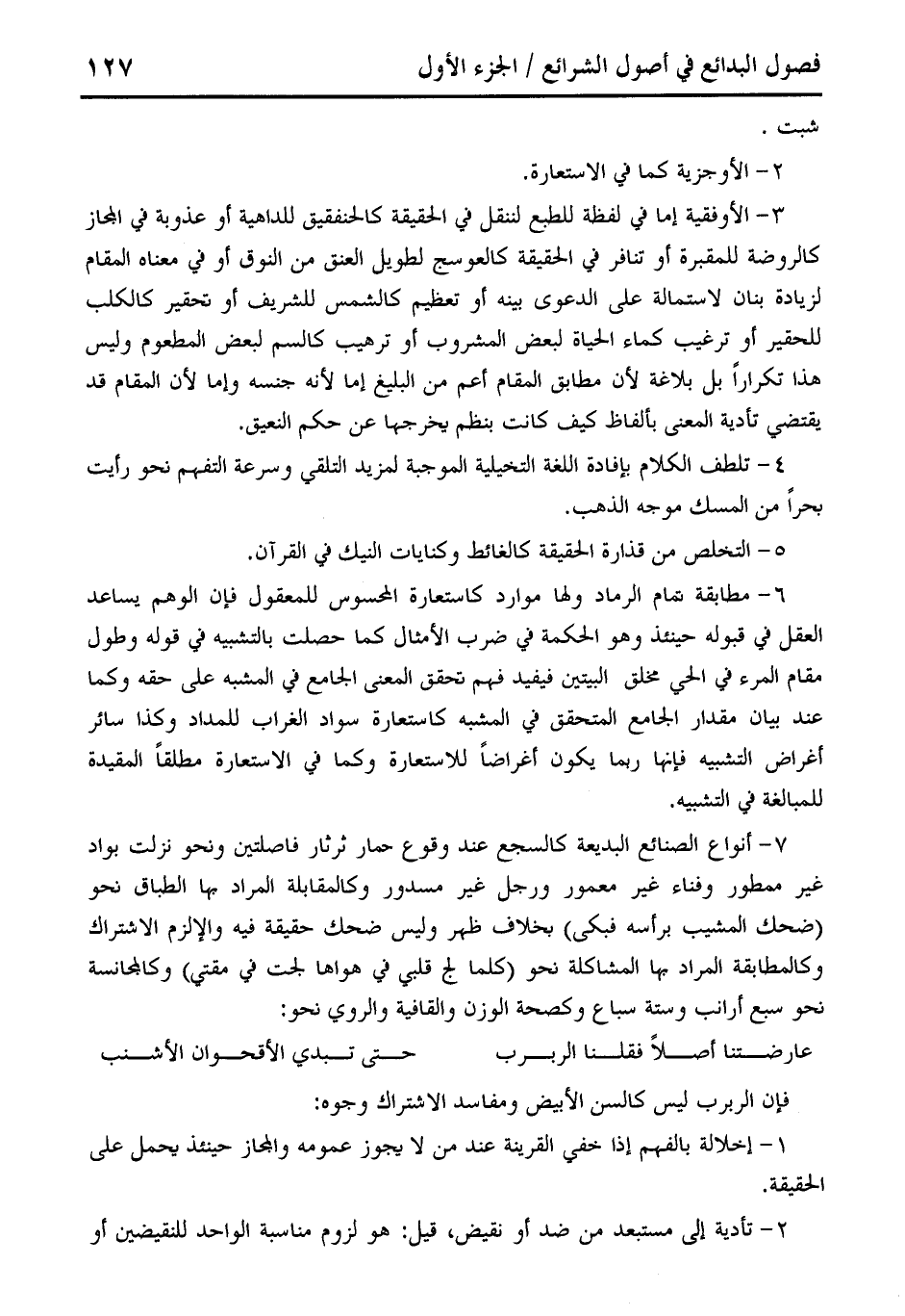 7 - أنواع الصنائع البديعة كالسجع عند وقوع حمار ثرثار فاصلتين ونحو نزلت بواد غير ممطور وفناء غير معمور ورجل غير مسدور وكالمقابلة المراد بها الطباق نحو (ضحك المشيب برأسه فبكى) بخلاف ظهر وليس ضحك حقيقة فيه والإلزم الاشتراك وكالمطابقة المراد بها المشاكلة نحو (كلما لج قلبي دي هواها لجت في مقتي) وكالمجانسة نحو سبع أرانب وستة سباع وكصحة الوزن والقافية والنووي نحو: